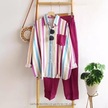 M-5xl Kadın Giyim İlkbahar Yaz Uzun Kollu Üst + Pantolon Yeni Çizgili Tek Sıra Yaka Gömlek + Geniş Paça Pantolon 2 Adet Kırmızı