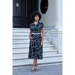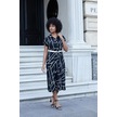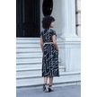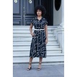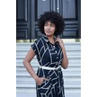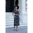 Kadın Desenli Yakalı Düşük Omuzlu Duble Kol Kemerli Midi Boy Elbise Deri Kemer Dahil -siyah Kareli Siyah Kareli