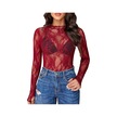 Kadın File Üst Uzun Kollu Balıkçı Yaka Şeffaf Bluz Şeffaf Çiçek Dantel Üstler Şarap Kırmızısı
