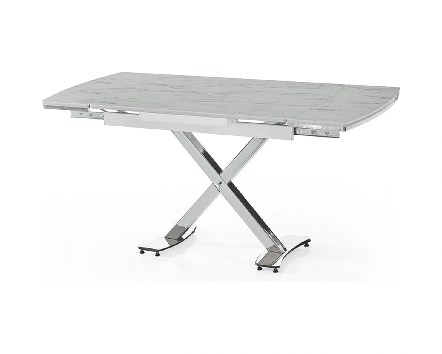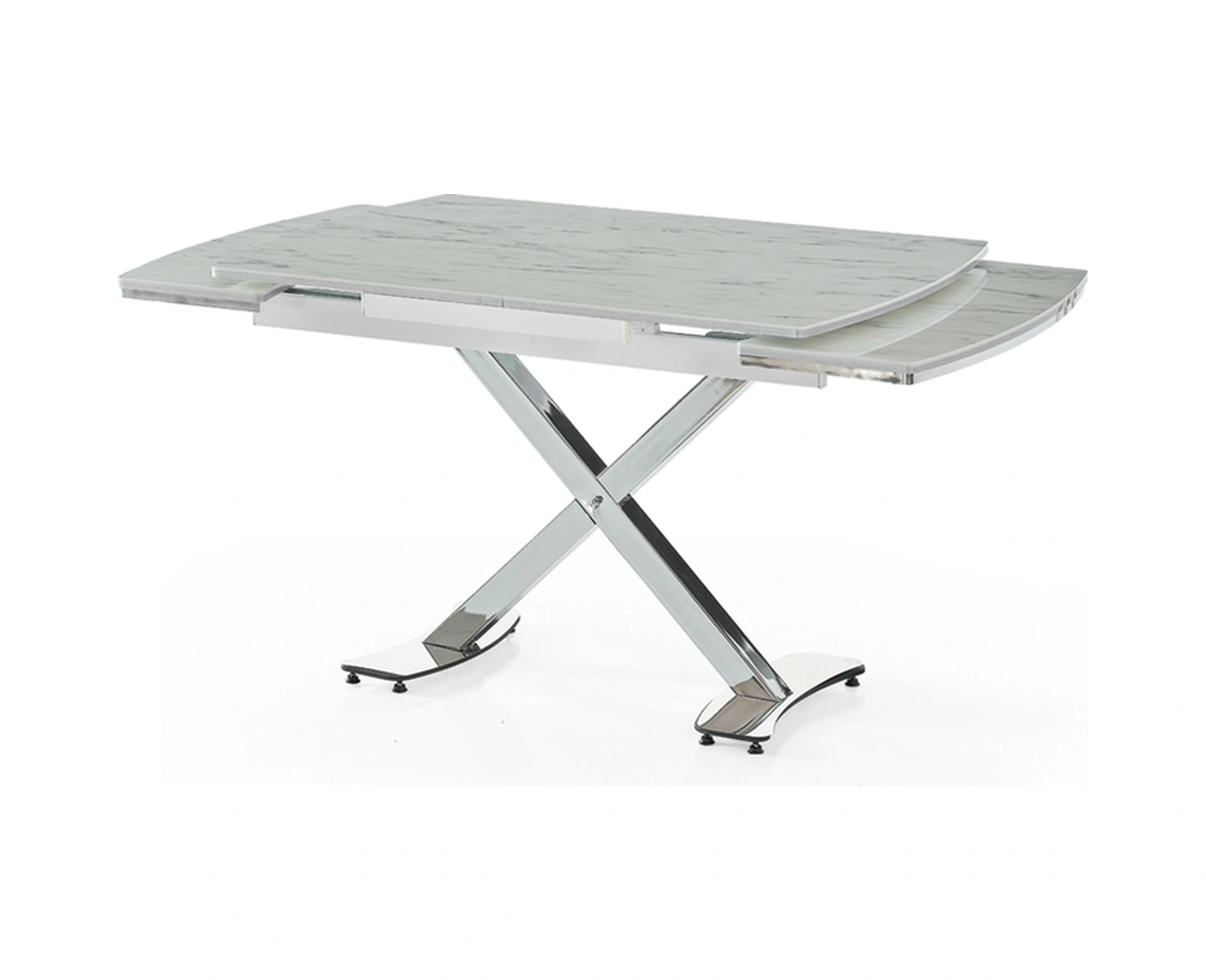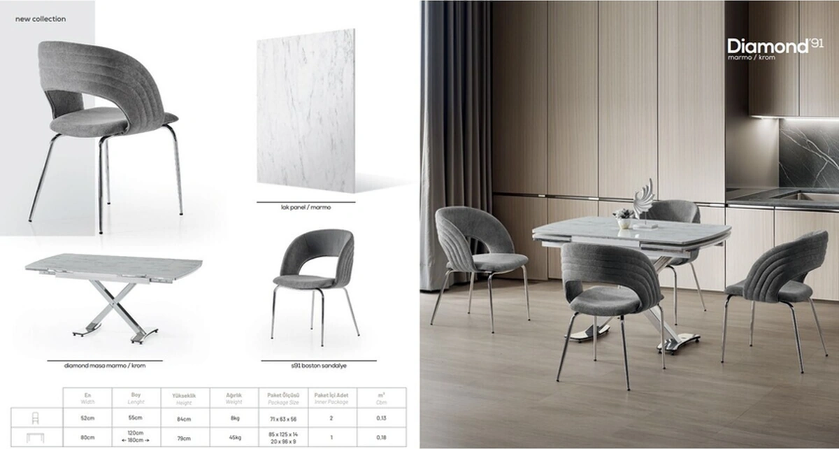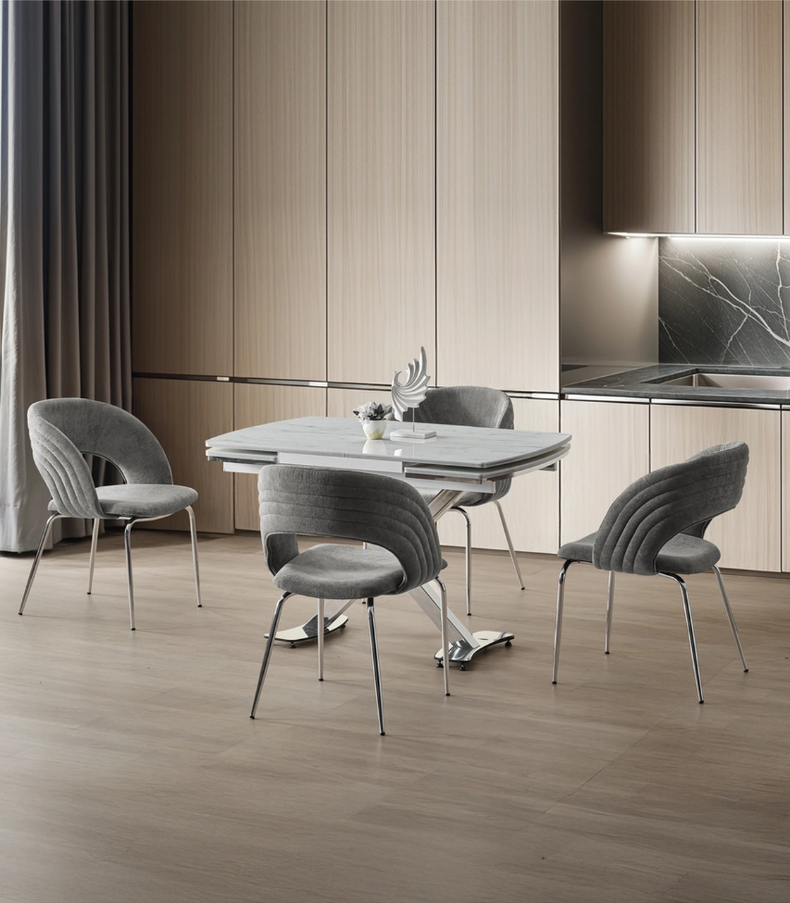 Dengema Diamond Açılır Masa Takımı Beyaz Mermer Krom Metal Ayak, 4 Sandalyeli, 80x120/180 Cm Beyaz Mermer - Krom Ayak