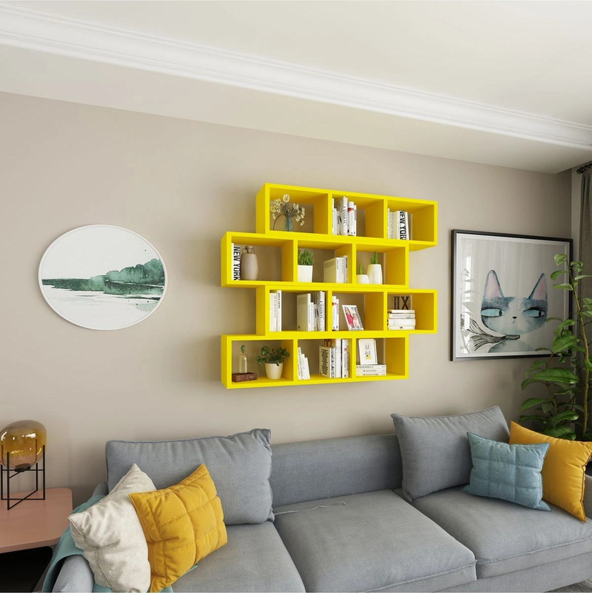 Kitaplık Modern Duvar Rafı Salon Yatay 4 Lü Takım Sarı Sarı