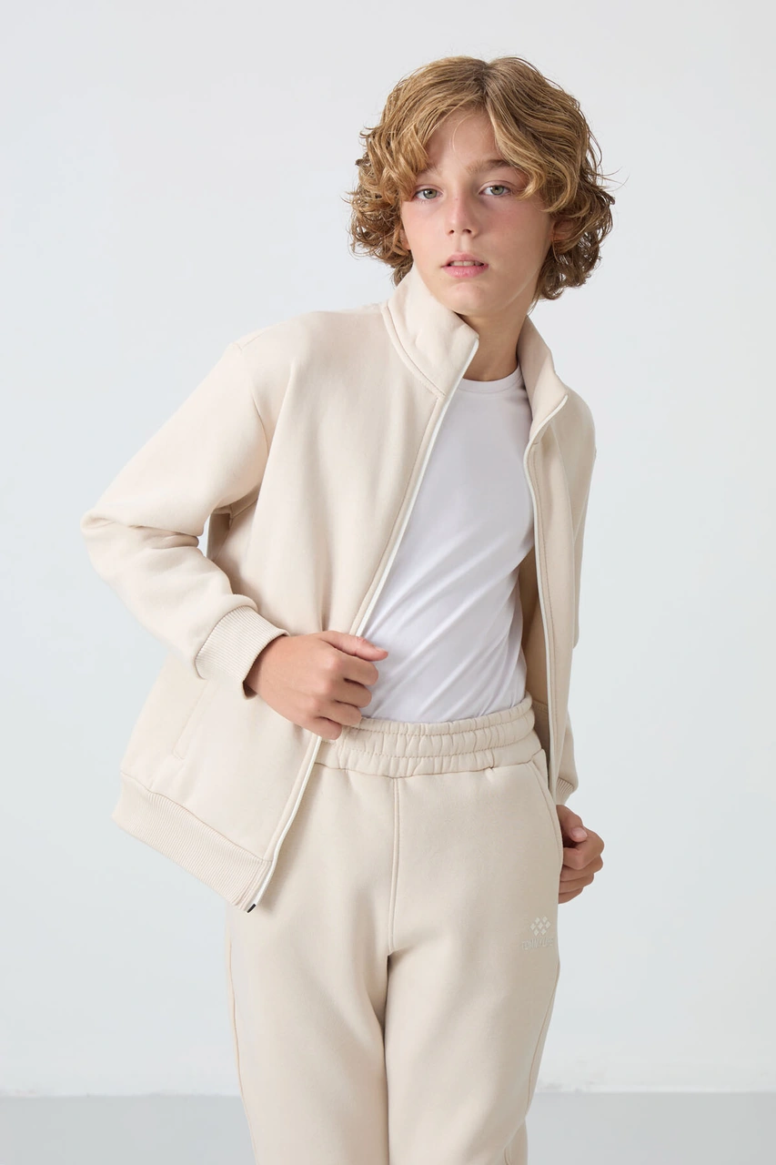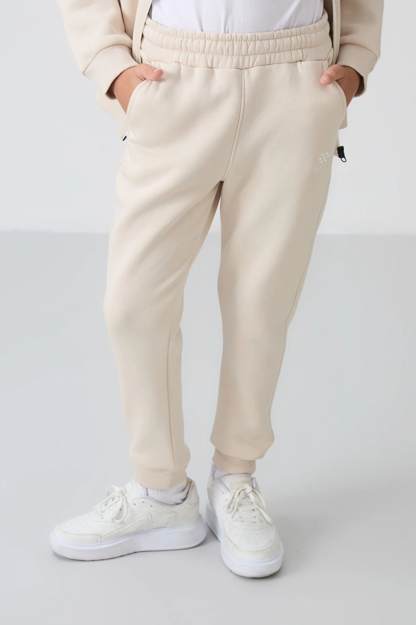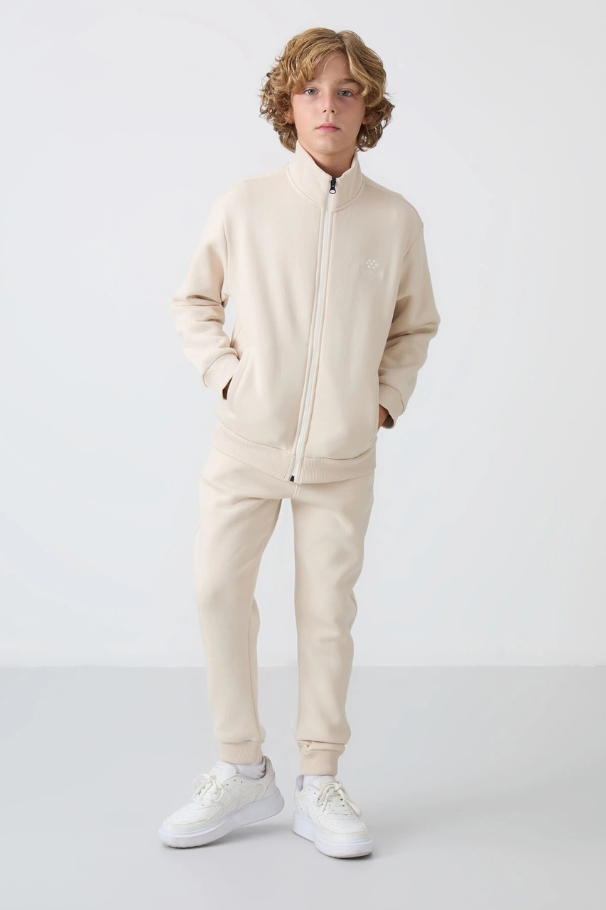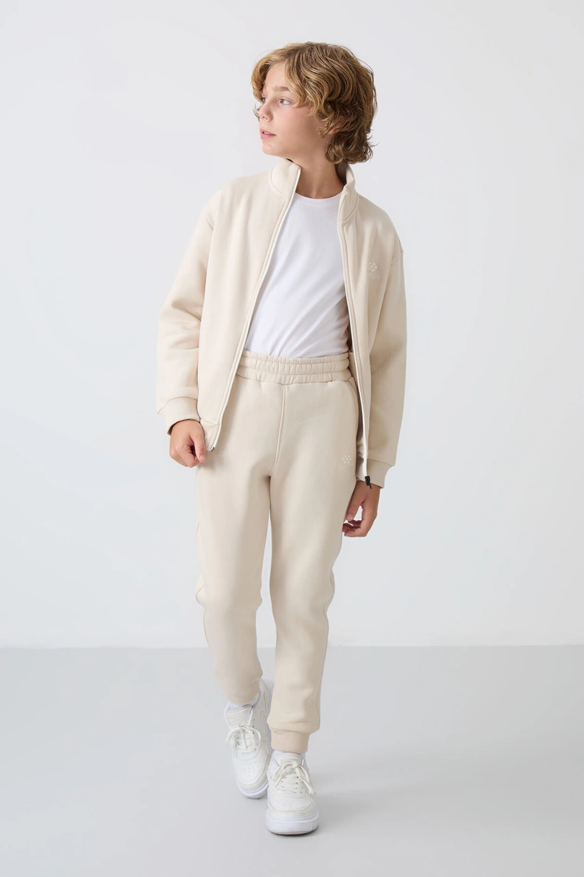 Bej Pamuklu Kalın İçi Tüylü Yumuşak Dokulu Standart Fit Nakışlı Erkek Çocuk Eşofman Takım - 11256 Bej