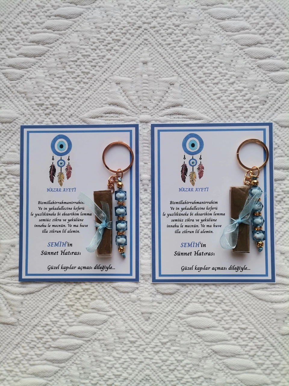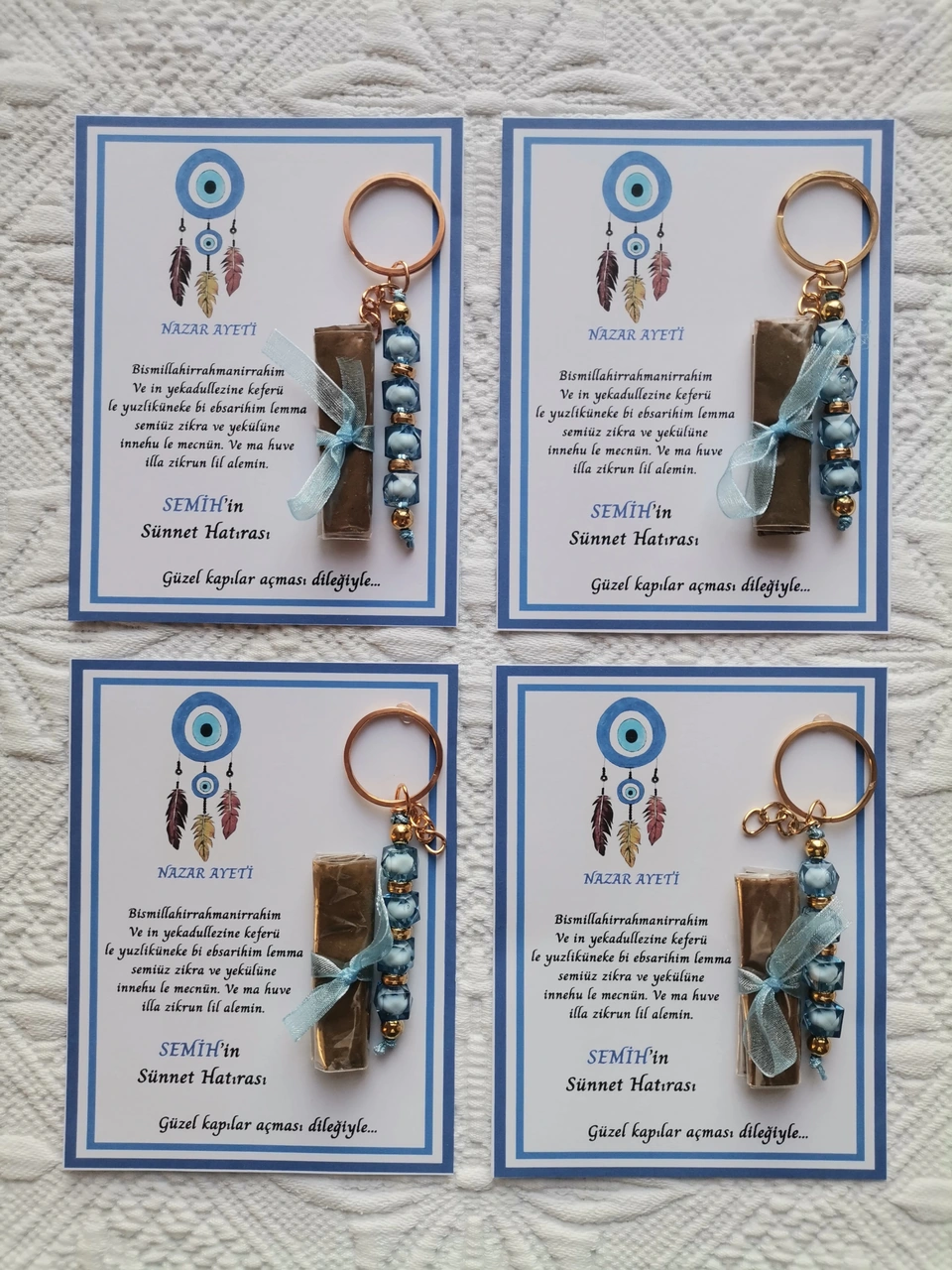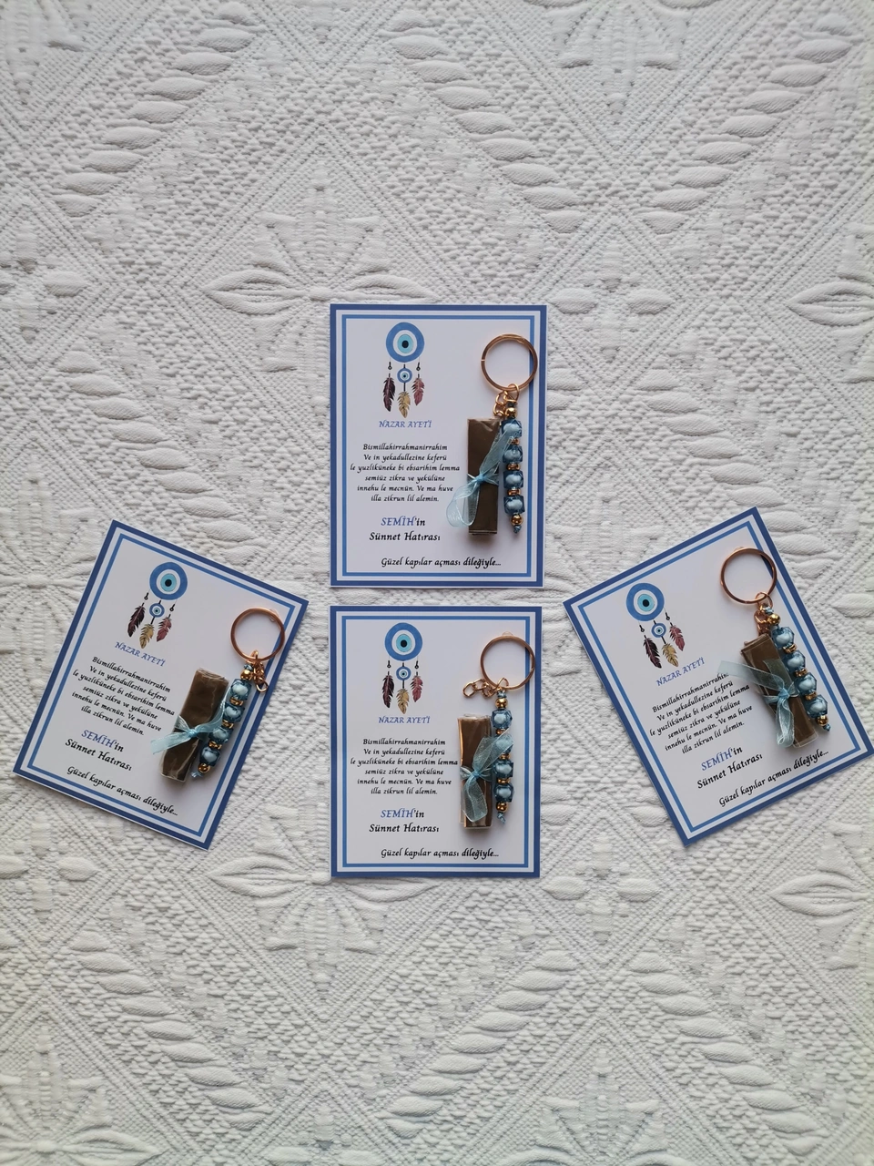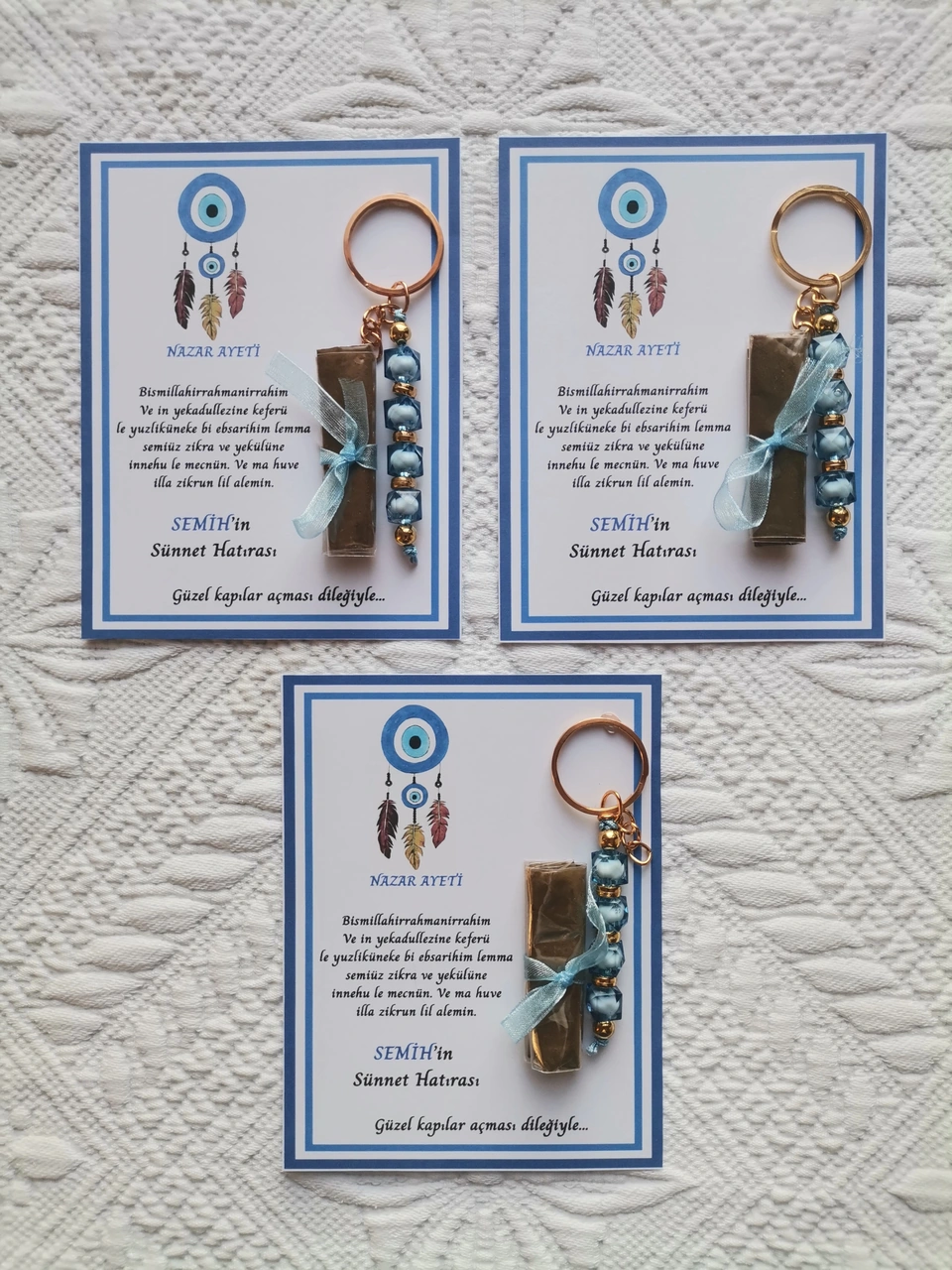 100 Adet Kişiye Özel Nazar Ayeti Sünnet Hatırası Dağıtmalık Hediyelik Mavi Renk Anahtarlık Ve Kına