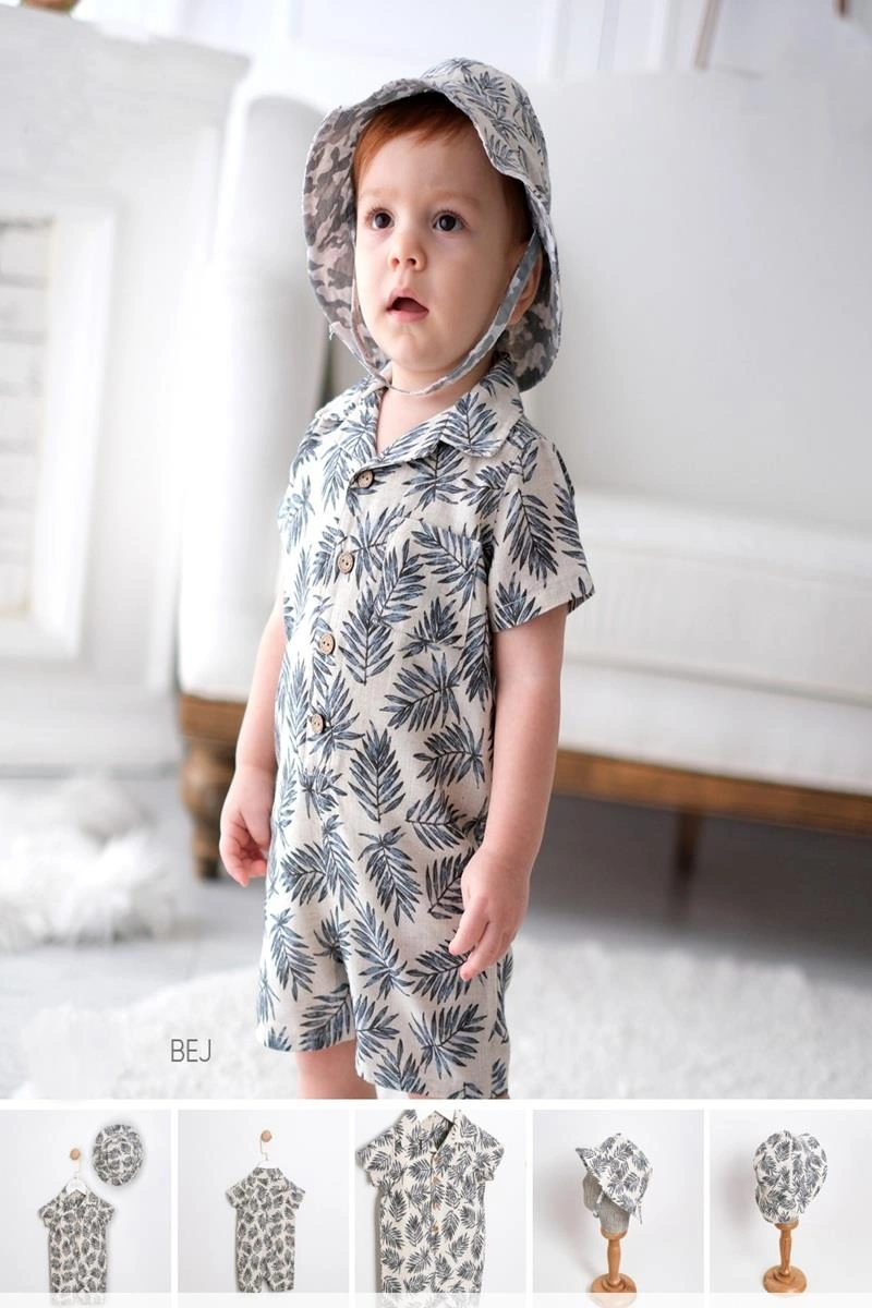 2'li Erkek Bebek Mavi Yaprak Desenli Tulum Şapkalı Takım-1363 Çok Renkli