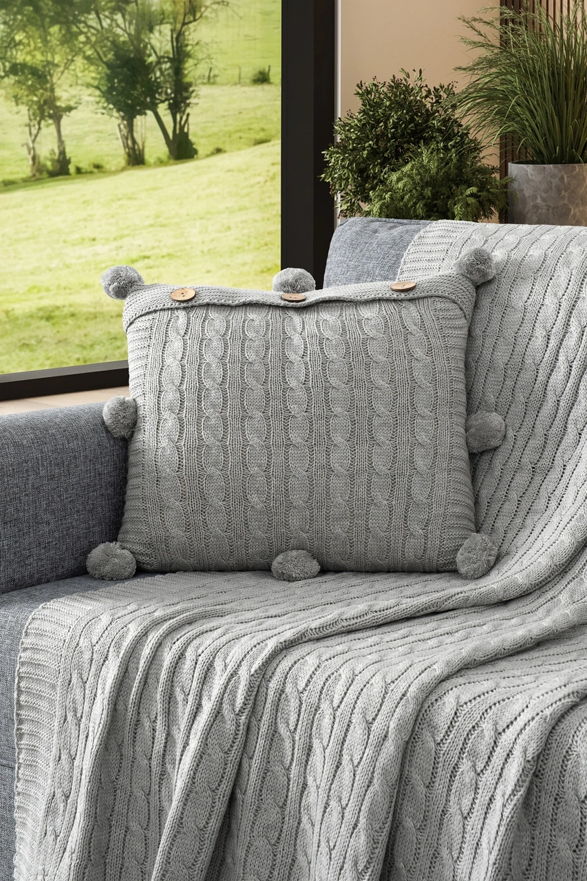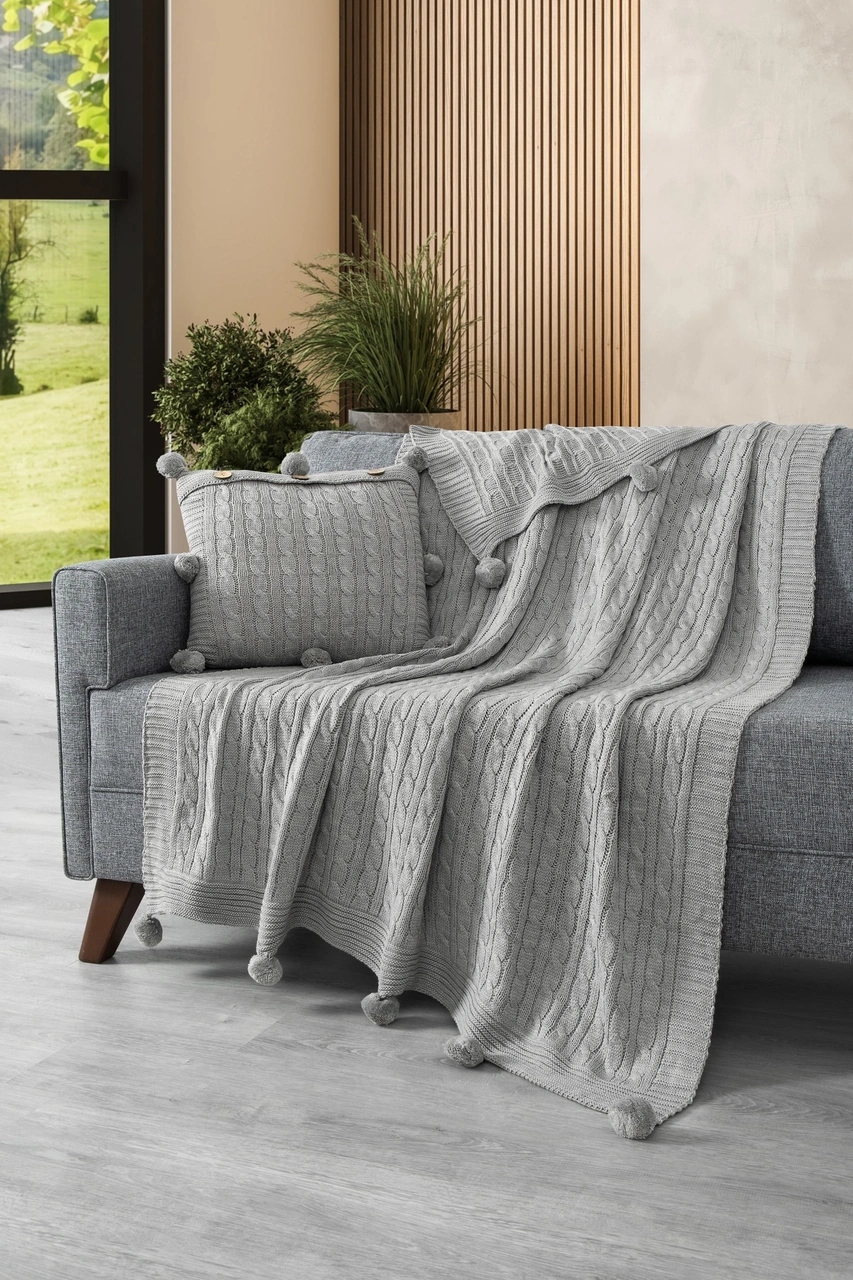 2'li Takım Ponponlu Triko Örme Kırlent Kılıfı & Tv Battaniyesi- Omuz & Koltuk Şalı Seti Acıkgrı Açık Gri