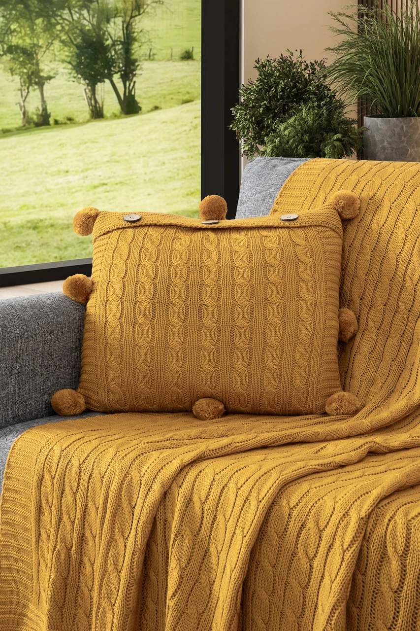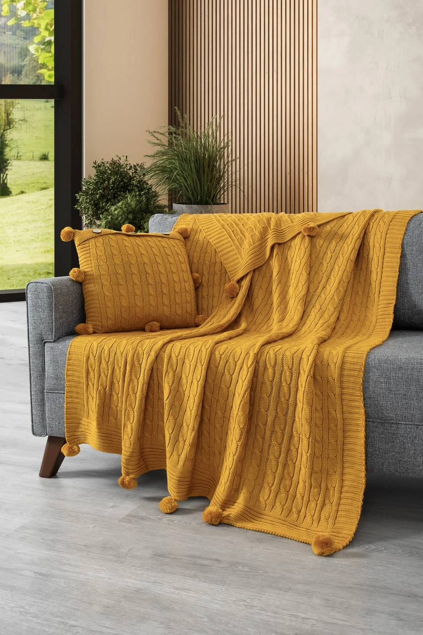 2'li Takım Ponponlu Triko Örme Kırlent Kılıfı & Tv Battaniyesi- Omuz & Koltuk Şalı Seti Hardal Hardal