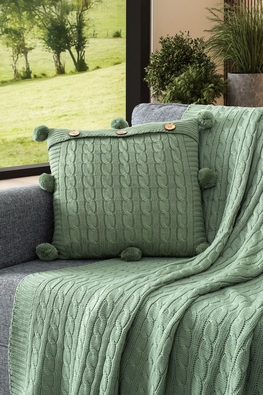 2'li Takım Ponponlu Triko Örme Kırlent Kılıfı & Tv Battaniyesi- Omuz & Koltuk Şalı Seti Mıntyesılı Mint Yeşili