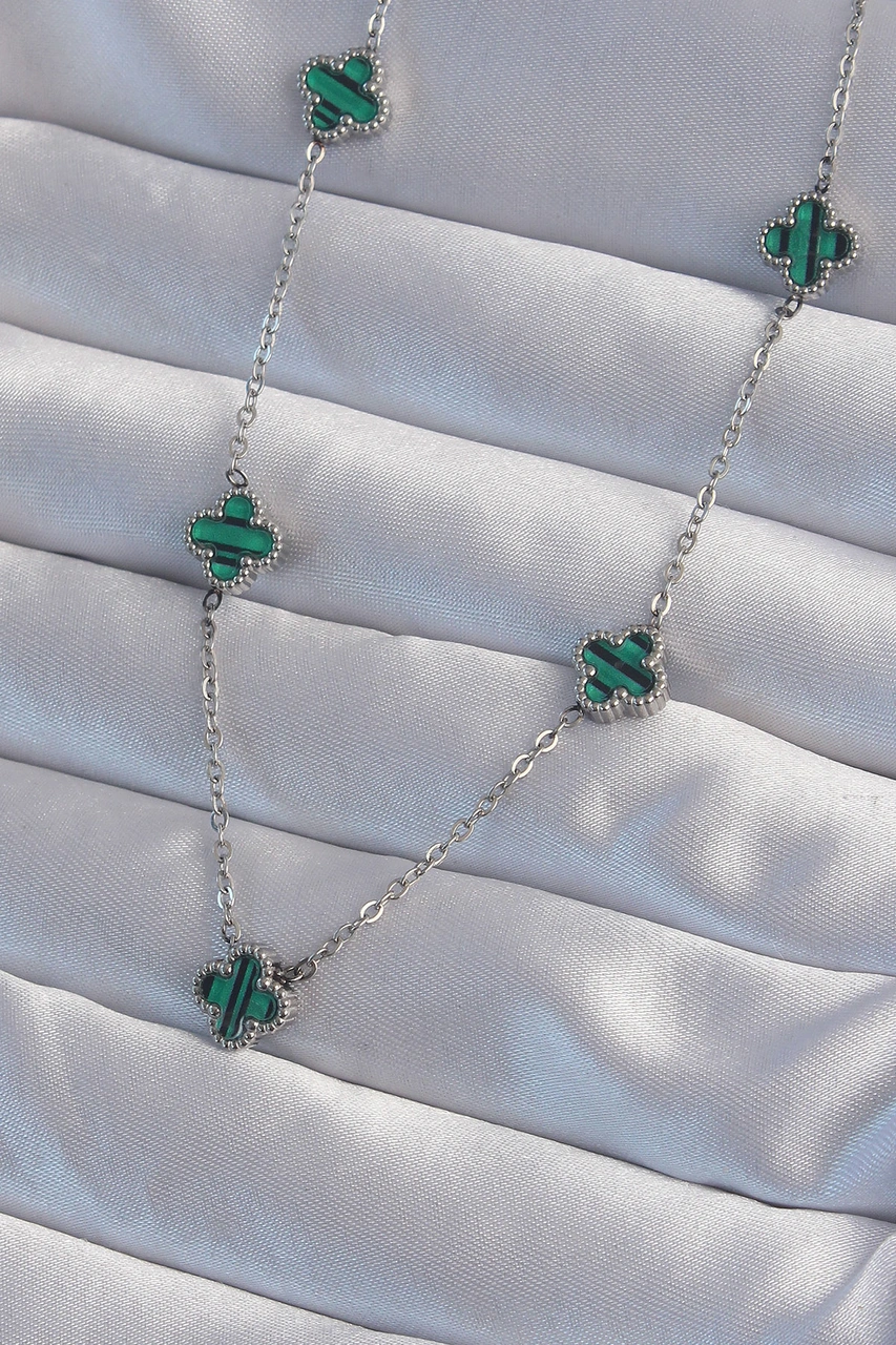 316l Çelik Gümüş Renk Minimal Yeşil Mineli Yonca Kolye Renkli