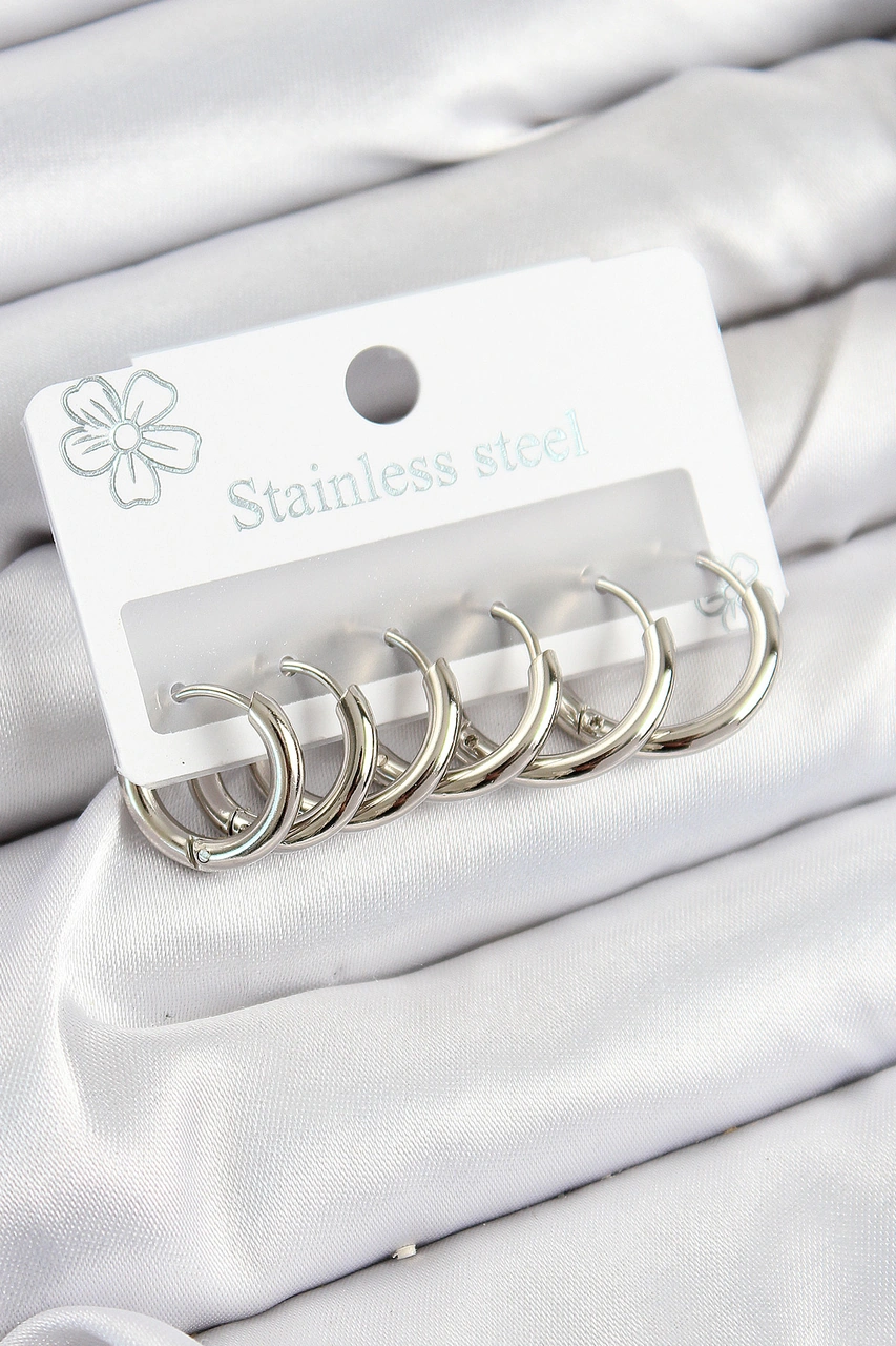 316l Çelik Halka Model Gümüş Renk 3'lü Set Kadın Küpe Renkli