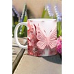 3d Görünümlü Pembe Çiçek Ve Kelebekler No:23 3d Tasarım Baskılı Kupa Bardak Mug Açık Haki