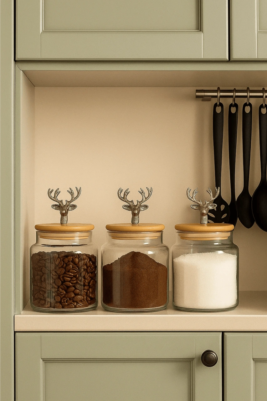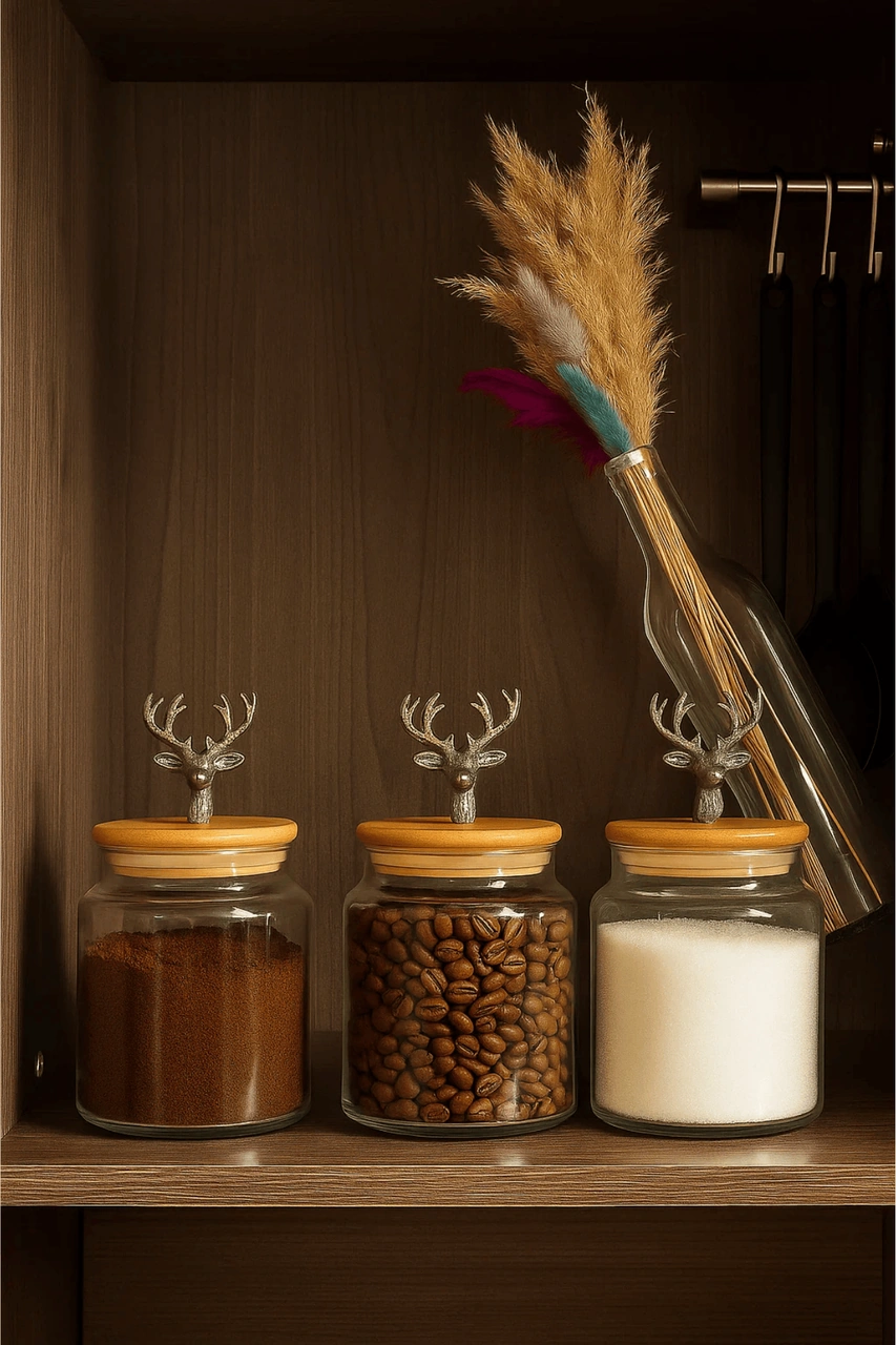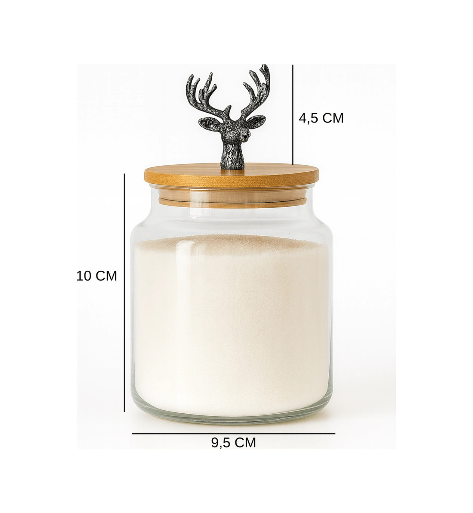 3'lü Metal Siyah Geyik Figürlü Bambu Kapaklı Cam Kavanoz Şık Saklama Kabı 635 Cc Şeffaf
