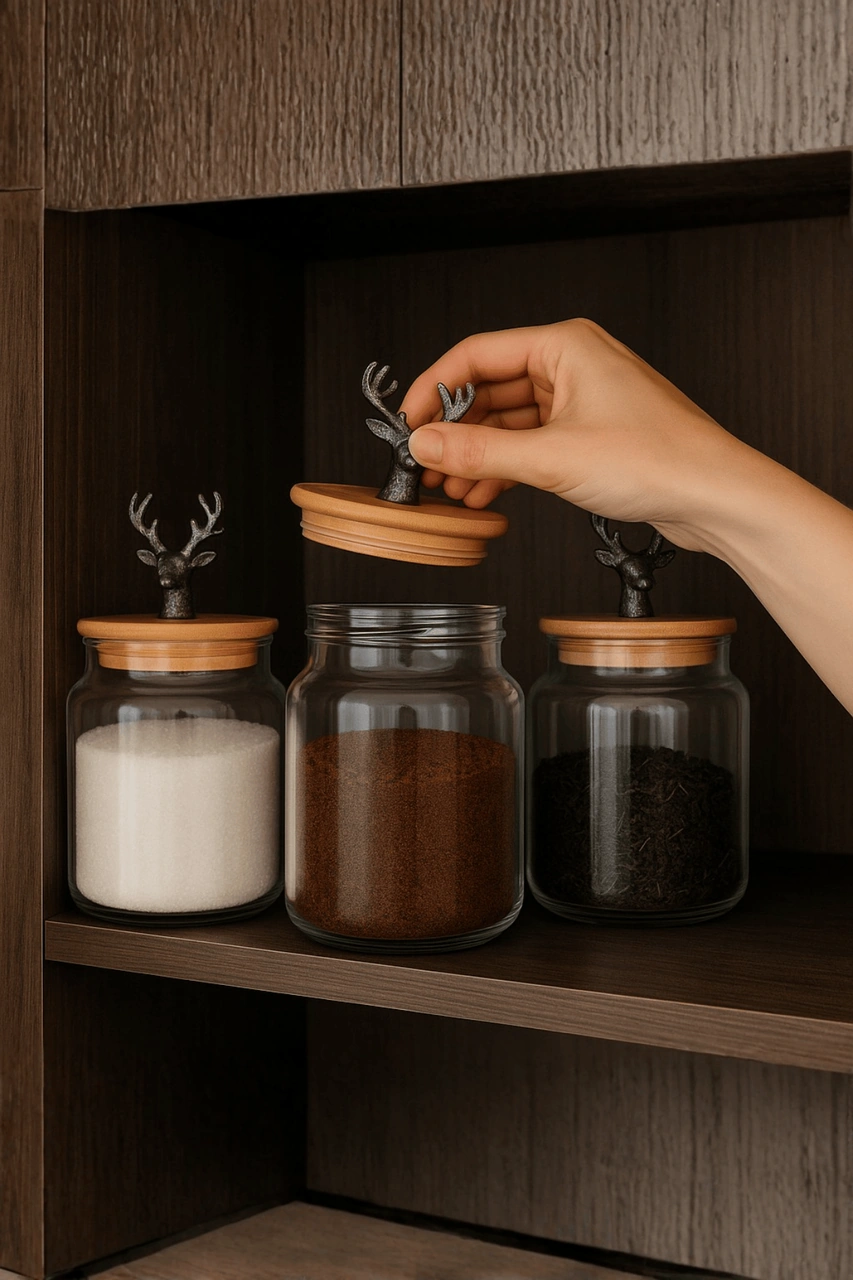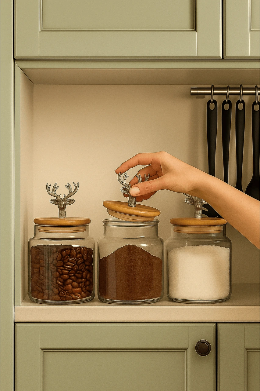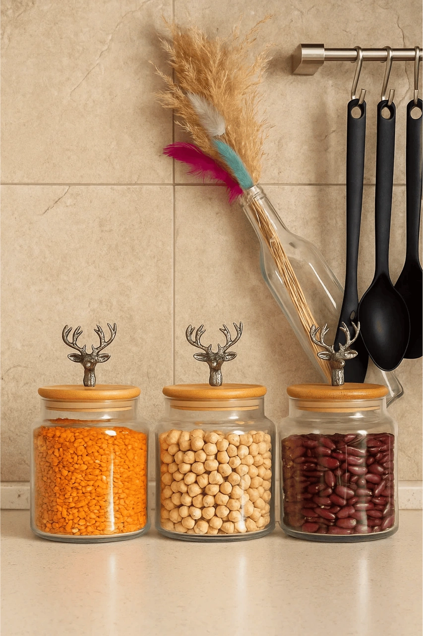 3'lü Metal Siyah Geyik Figürlü Bambu Kapaklı Cam Kavanoz Şık Saklama Kabı 635 Cc Şeffaf
