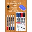 4 Adet Tahta Kalem Seti 2 Mavi 1 Kırmızı 1 Siyah Tahta Silgisi Çok Renkli