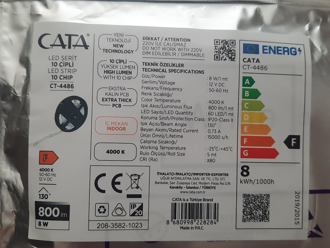 Daha önceden de alıp kullandığım, renginden çok hoşlandığım 4000K yine tercihim oldu. Özellikle cata markası çok kaliteli. Aynı satıcıdan ayrı ayrı zamanlarda 10 adet aldım. Ölçtüğümde gerçekten metrede 8 watt güç tüketimine sahip