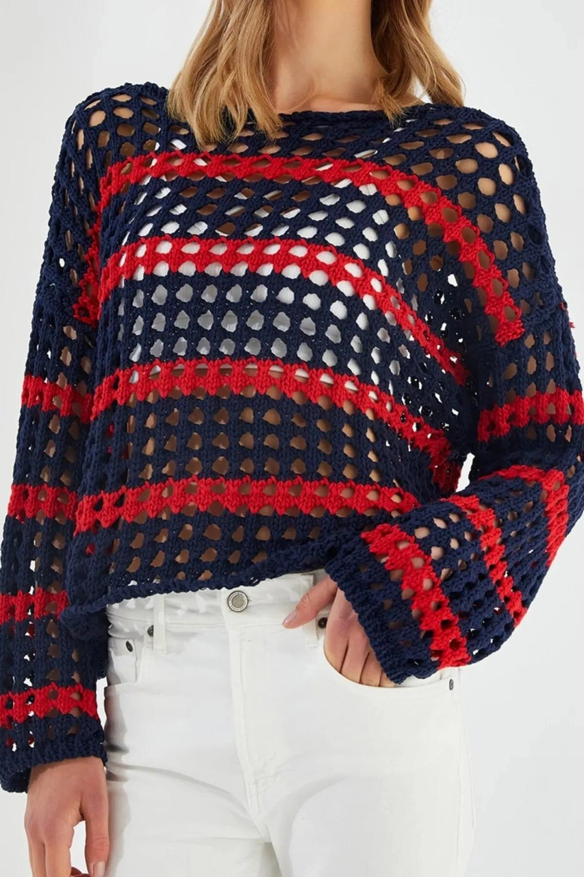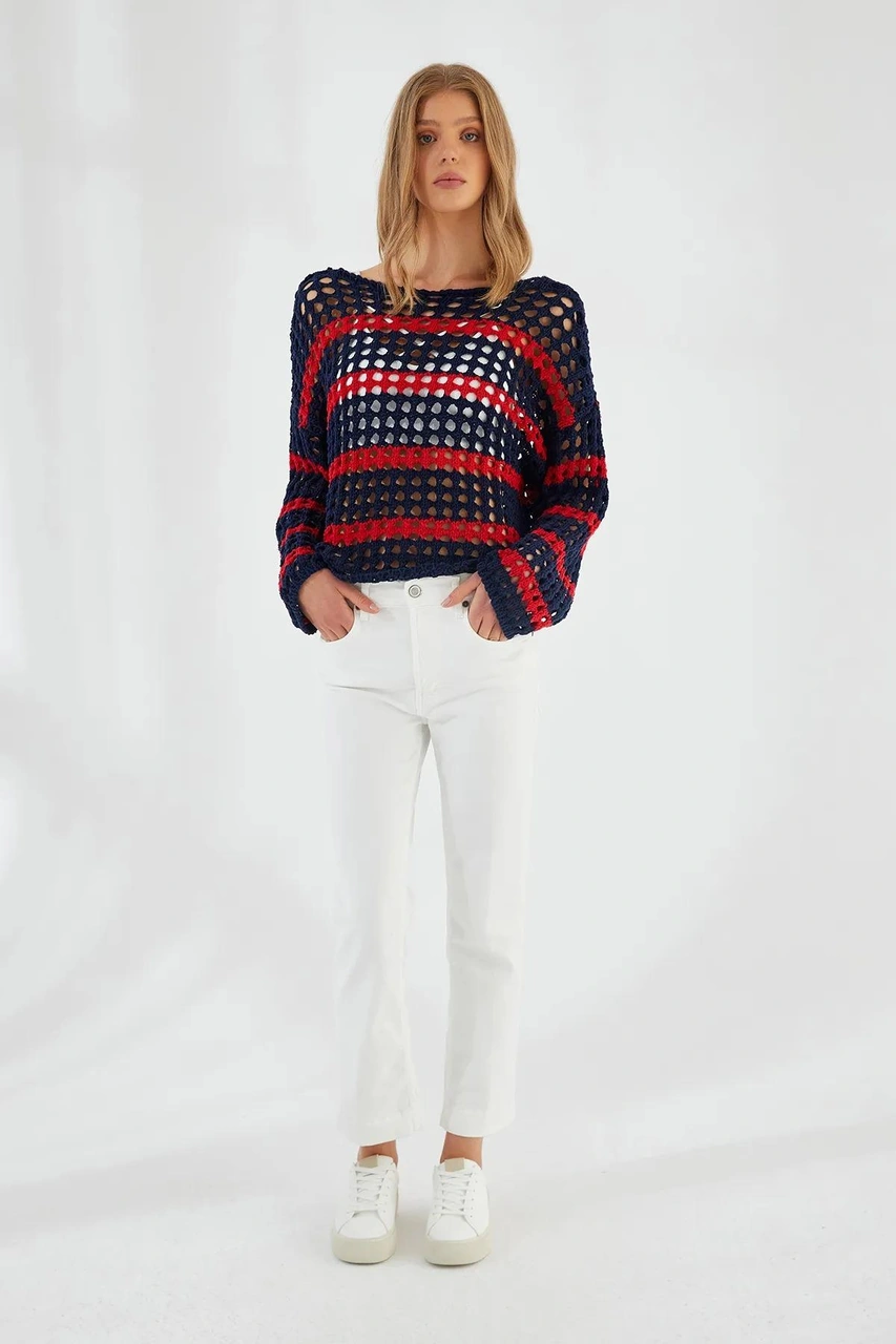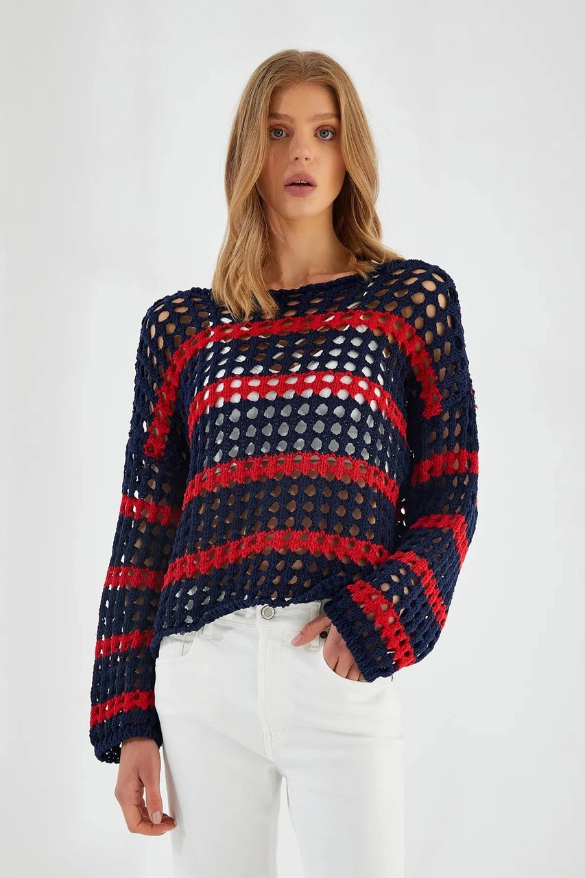 6877 Kadın Çizgili Ajurlu Kayık Yaka Triko Kazak Lacivert Lacivert