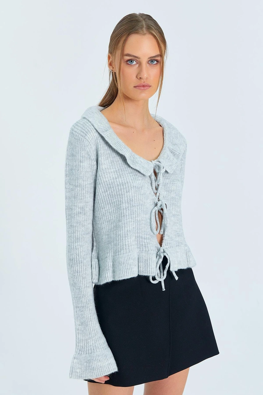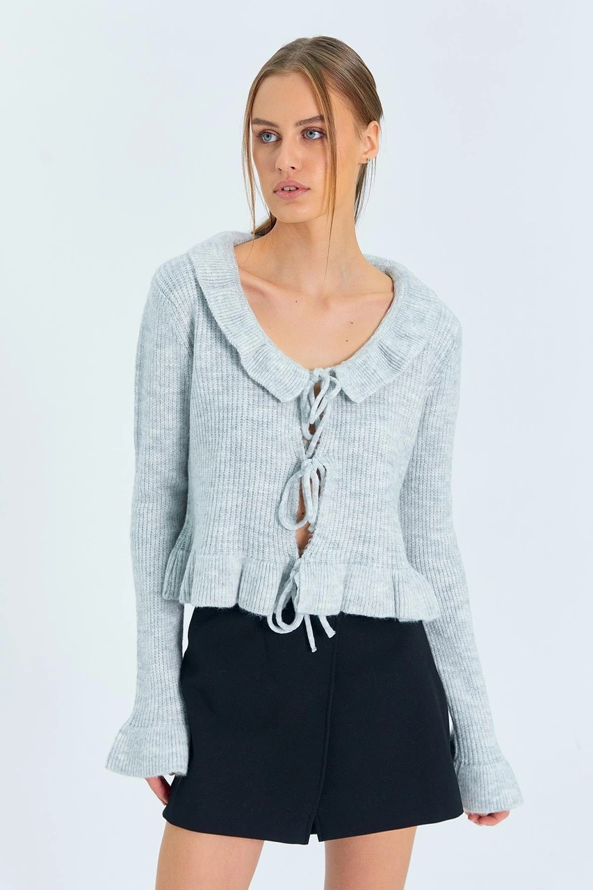 6899 Kadın Önden Bağcıklı Hırka Gri Gri