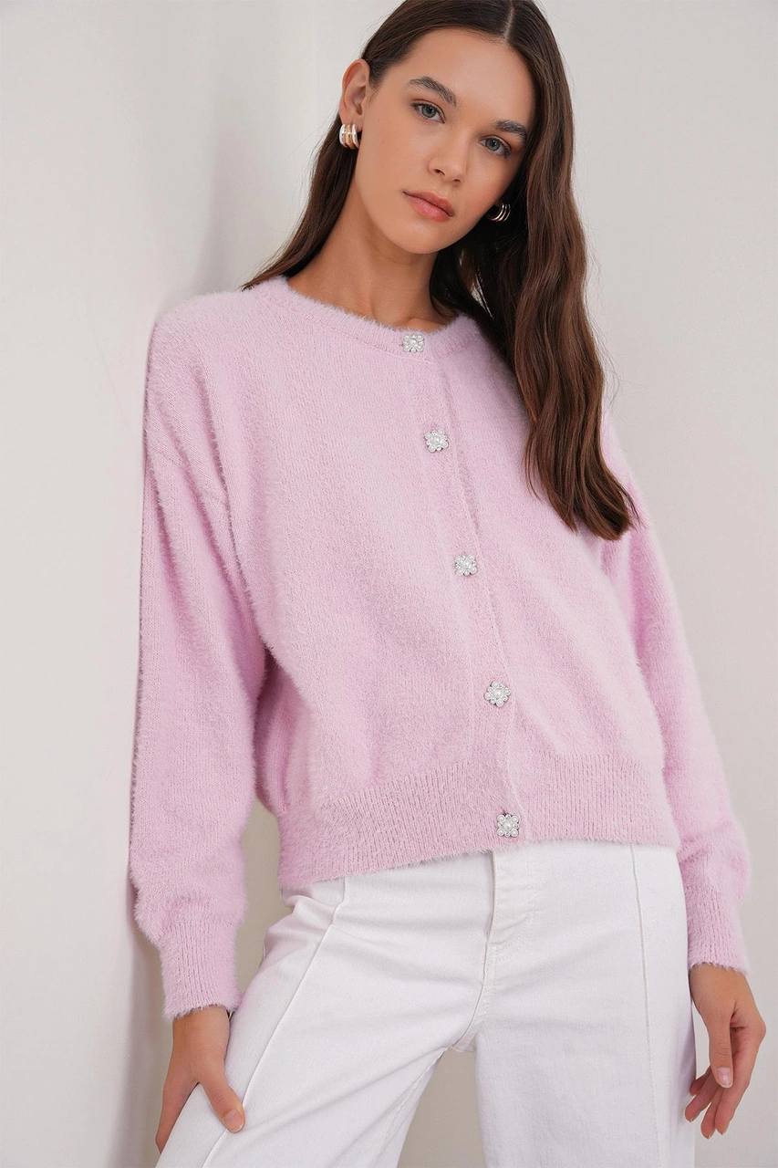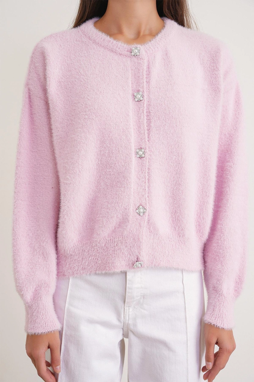 6902 Kadın Sakallı Basic Yumuşak Dokulu Triko Hırka Pembe Pembe