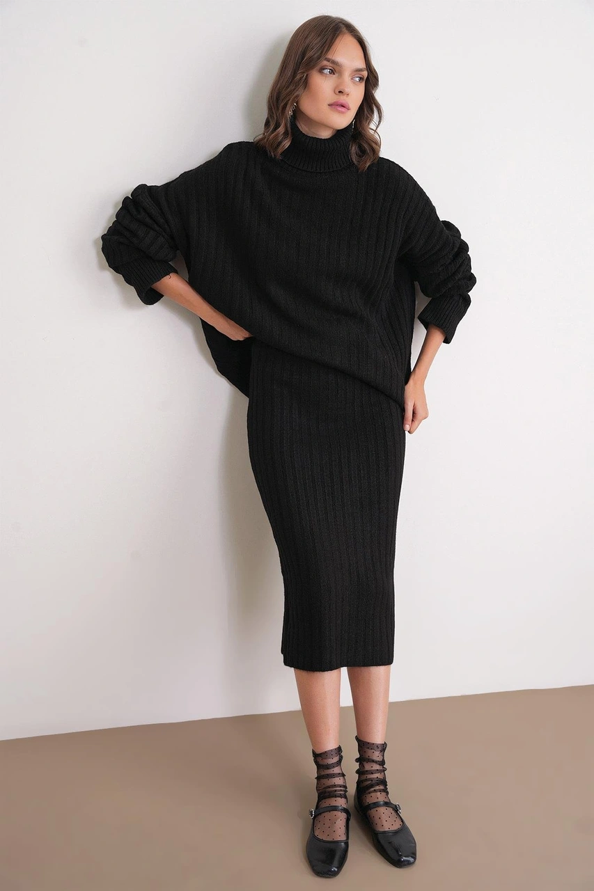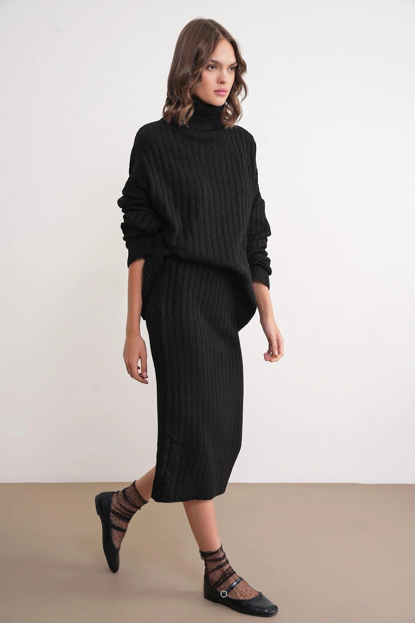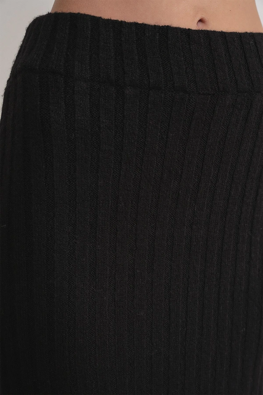 6929 Kadın Fitilli Triko Etek Siyah Siyah