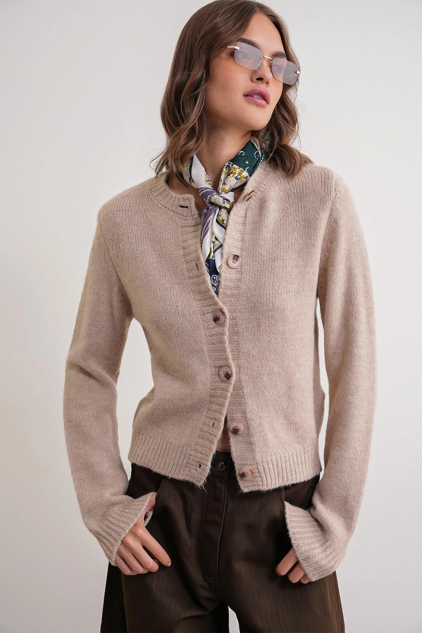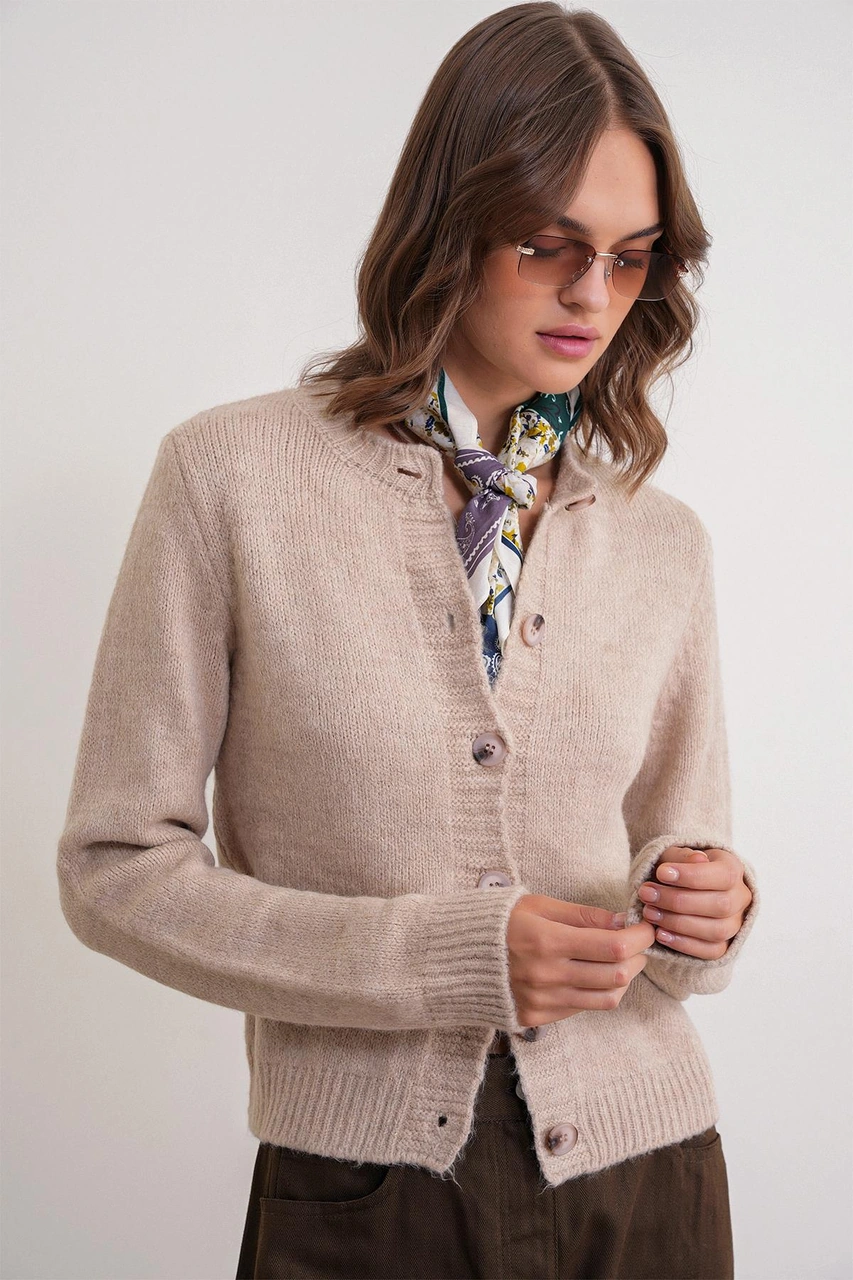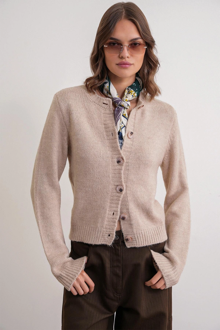 6951 Kadın Bisiklet Yaka Düğmeli Triko Kısa Hırka Bej Bej