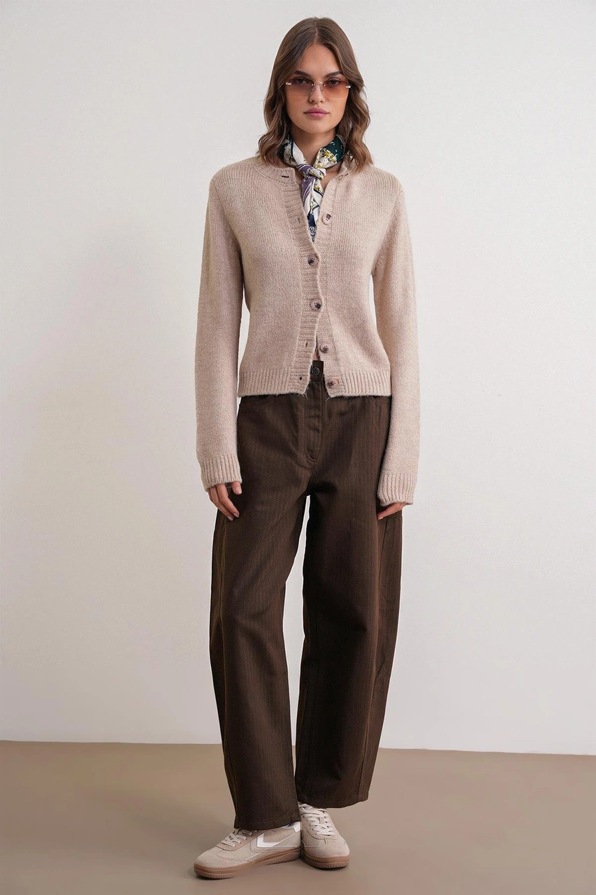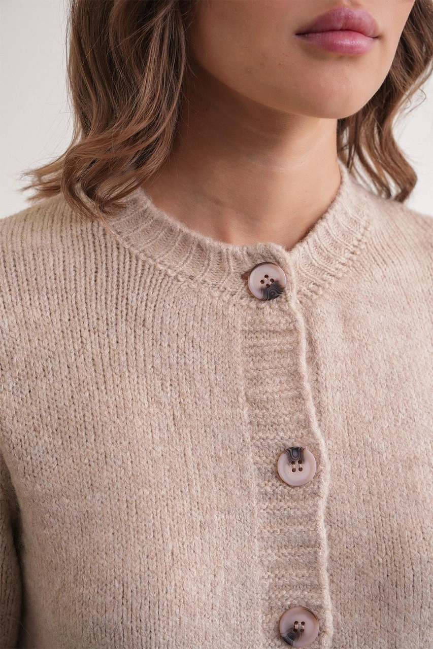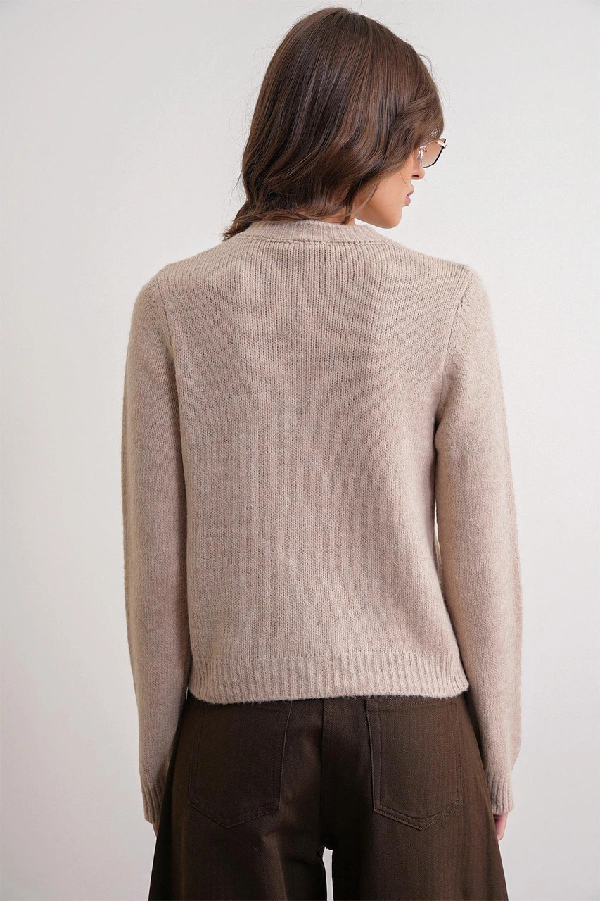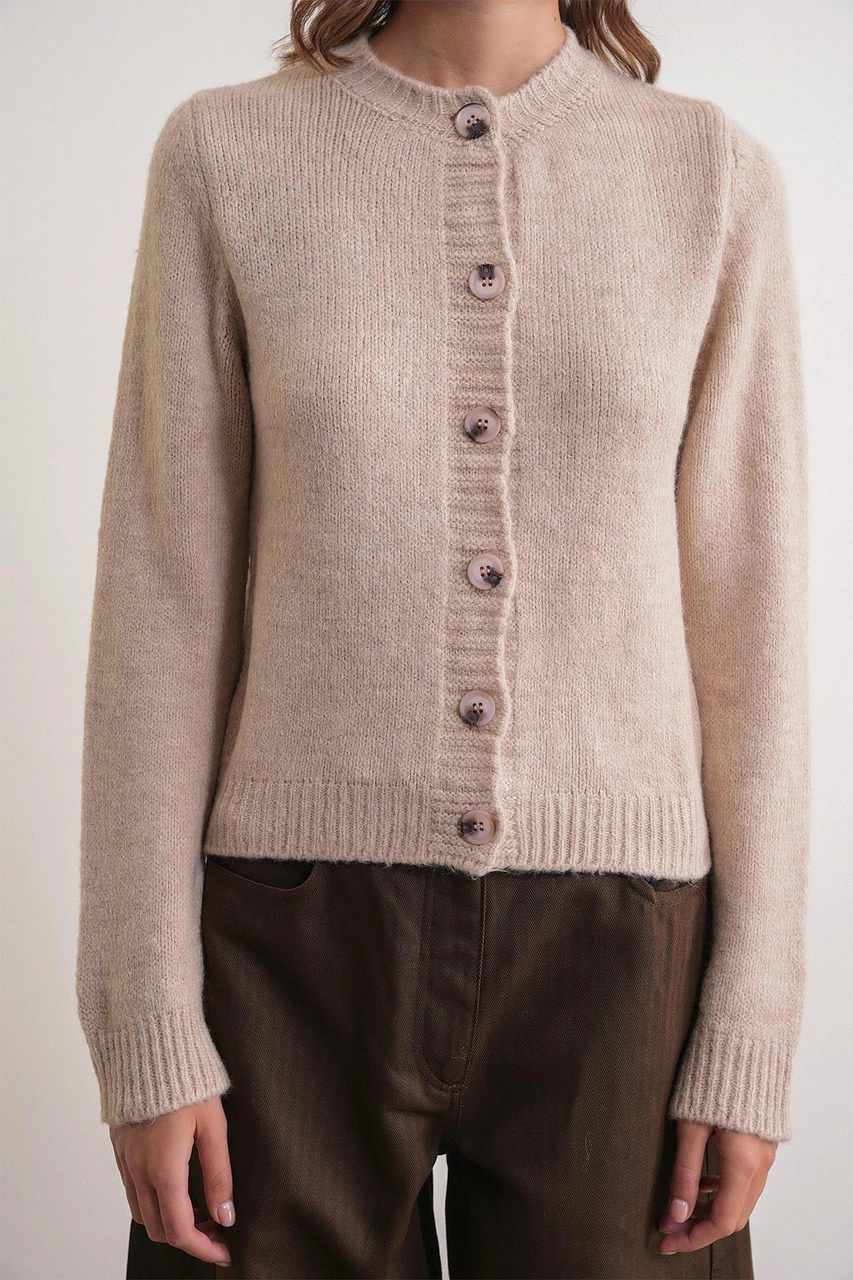 6951 Kadın Bisiklet Yaka Düğmeli Triko Kısa Hırka Bej Bej