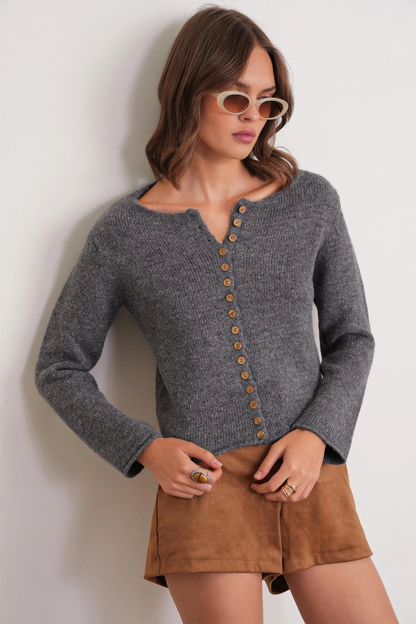 6957 Kadın Düğmeli Bisiklet Yaka Triko Hırka Antrasit Antrasit