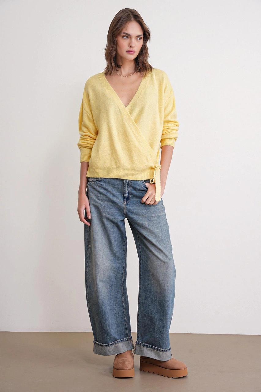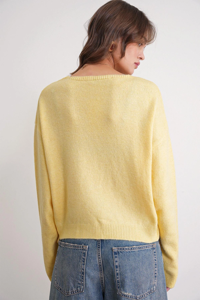 6959 Kadın Fiyonklu Triko Hırka Sarı Sarı
