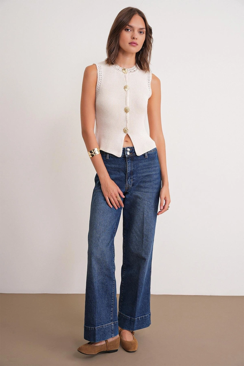 6962 Kadın Gold Düğmeli Triko Yelek Naturel Naturel