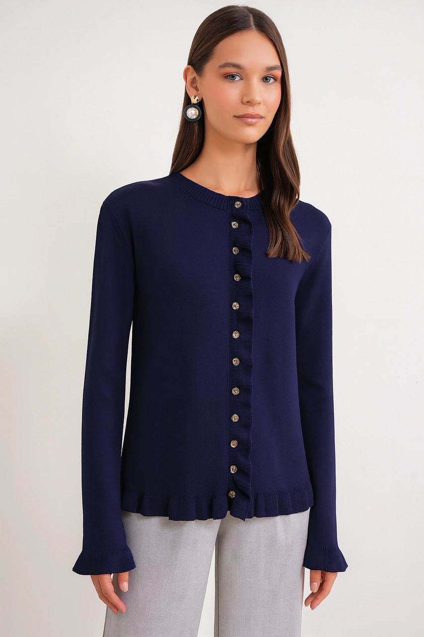 6964 Kadın Düz Fırfırlı Düğmeli Hırka Lacivert Lacivert