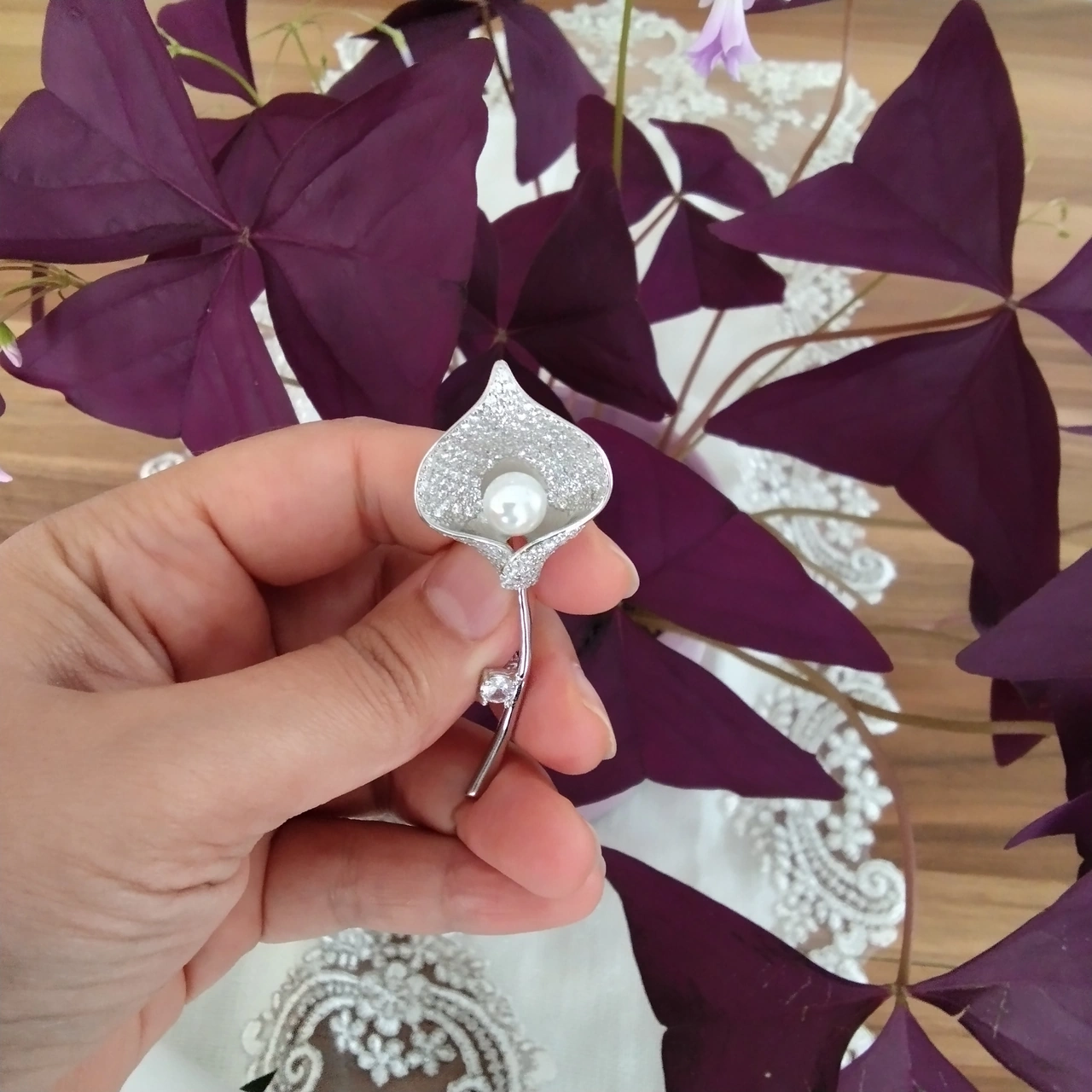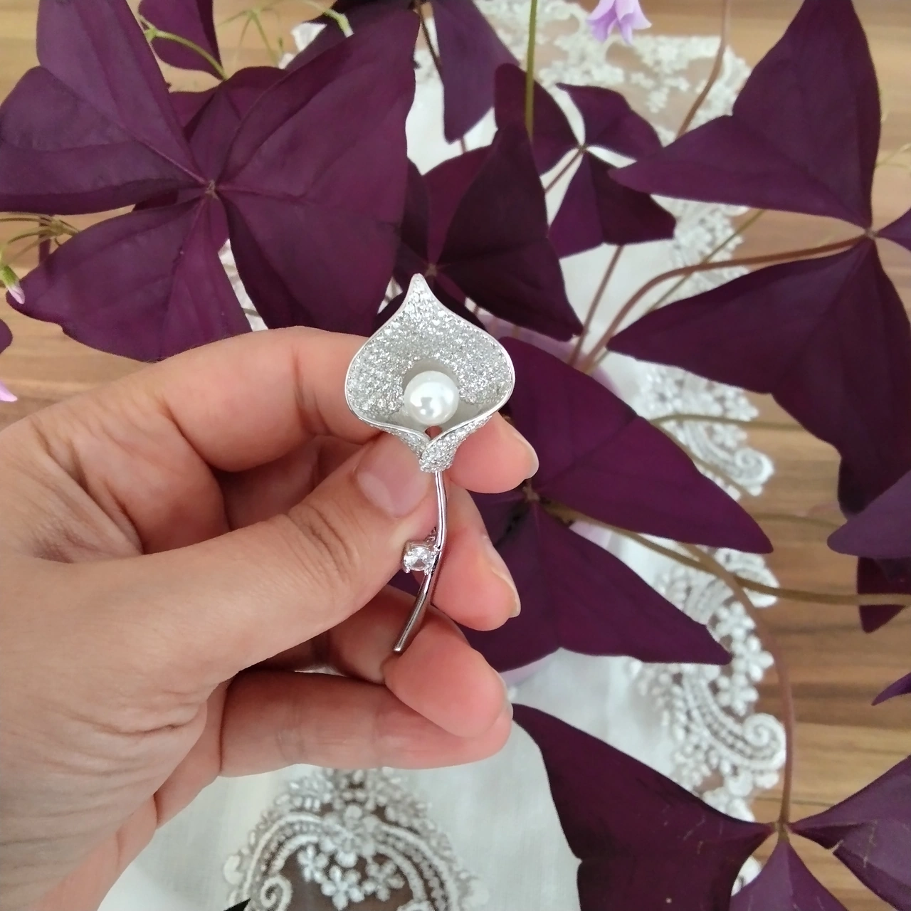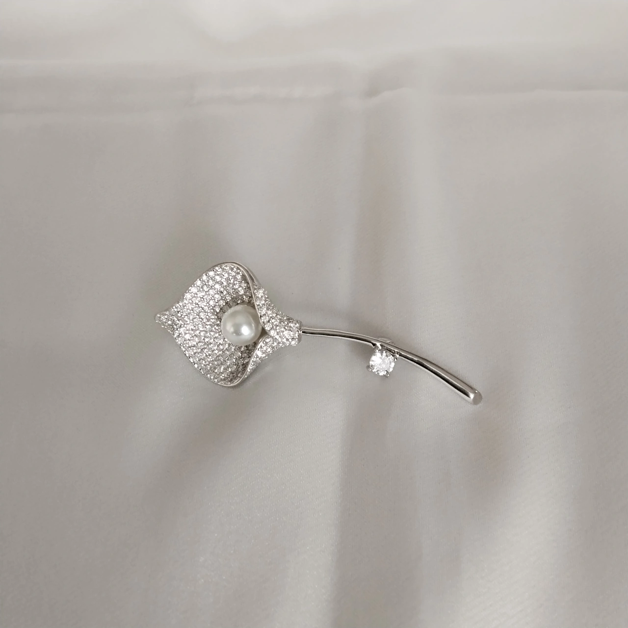925 Ayar Gümüş Kadın Broş- İncili Lale Detaylı Gümüş