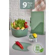 9'lu Mutfak Hazırlık Seti - Dik Standlı Kulplu Kesme Tahtası Karıştırma Kabı Süzgeç Limon Sıkacağı Yeşil