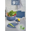 9'lu Mutfak Hazırlık Seti - Yatay Standlı Kulplu Kesme Tahtası Karıştırma Kabı Süzgeç Limon Sıkacağı Mavi