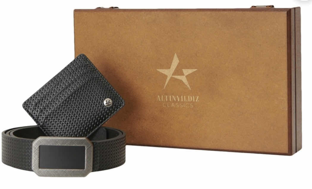 AC&Co / Altınyıldız Classics Erkek Siyah Özel Ahşap Hediye Kutulu Kemer - Kartlık Aksesuar Set Damat Bohçası Siyah