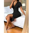Ahes Shopping Kadın Kısa Kollu Derin Dekolte V Yakalı Yırtmaçlı Midi Janjan Krep Elbise Siyah