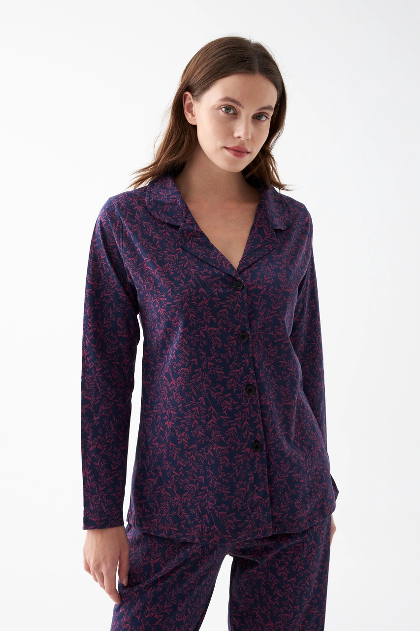 Akbeniz Kadın Lacivert Düğmeli Yaka Detaylı Desenli Pamuklu Pijama Takımı Lacivert