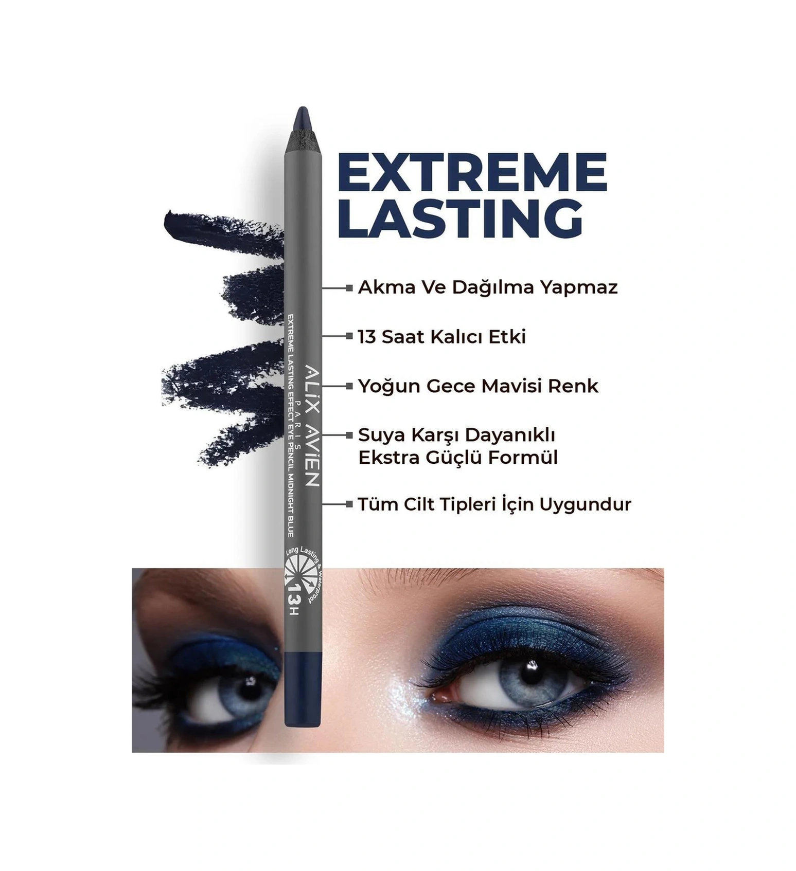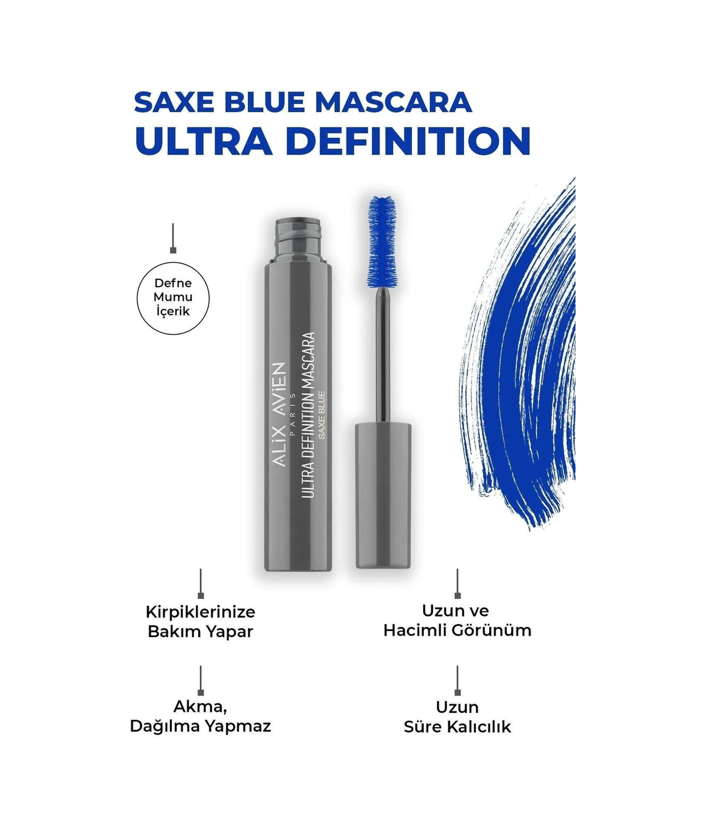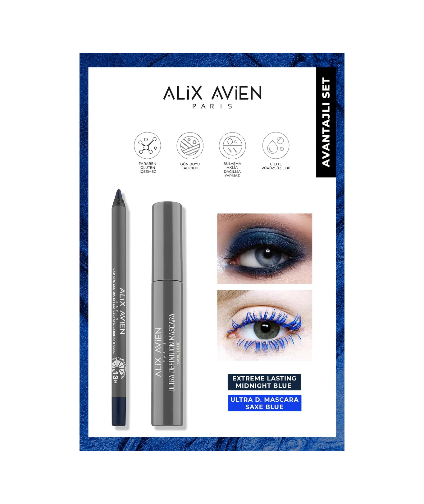 Alix Avien Uzun Süre Kalıcı Dolgunlaştırıcı Hacim Veren Topaklanmayan Suya Dayanıklı Mavi Göz Makyaj Seti