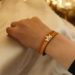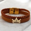 Archin T Harfine Özel 14 Ayar Altın Plakalı Kahverengi Derili Taç Motifli Hediye Bileklik-467harf T