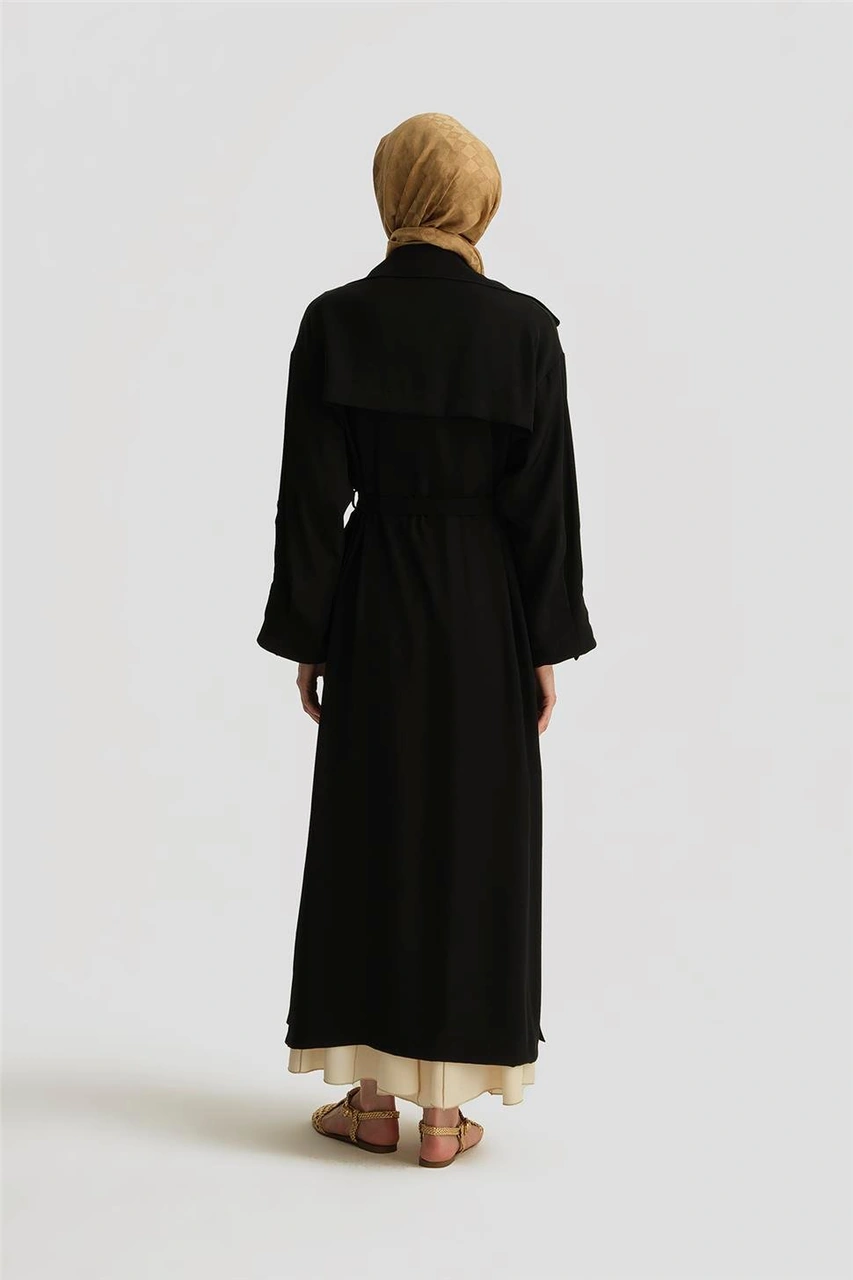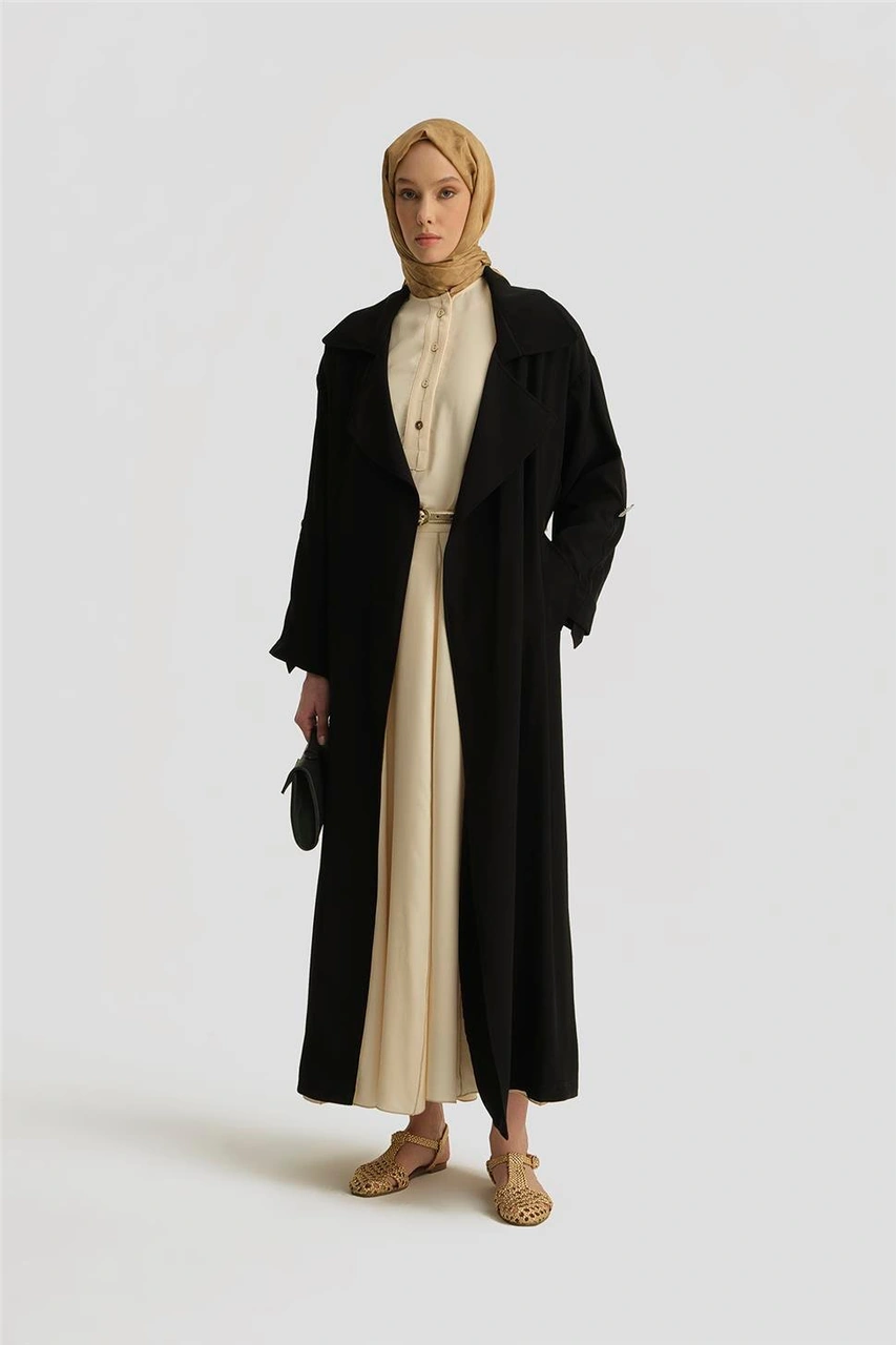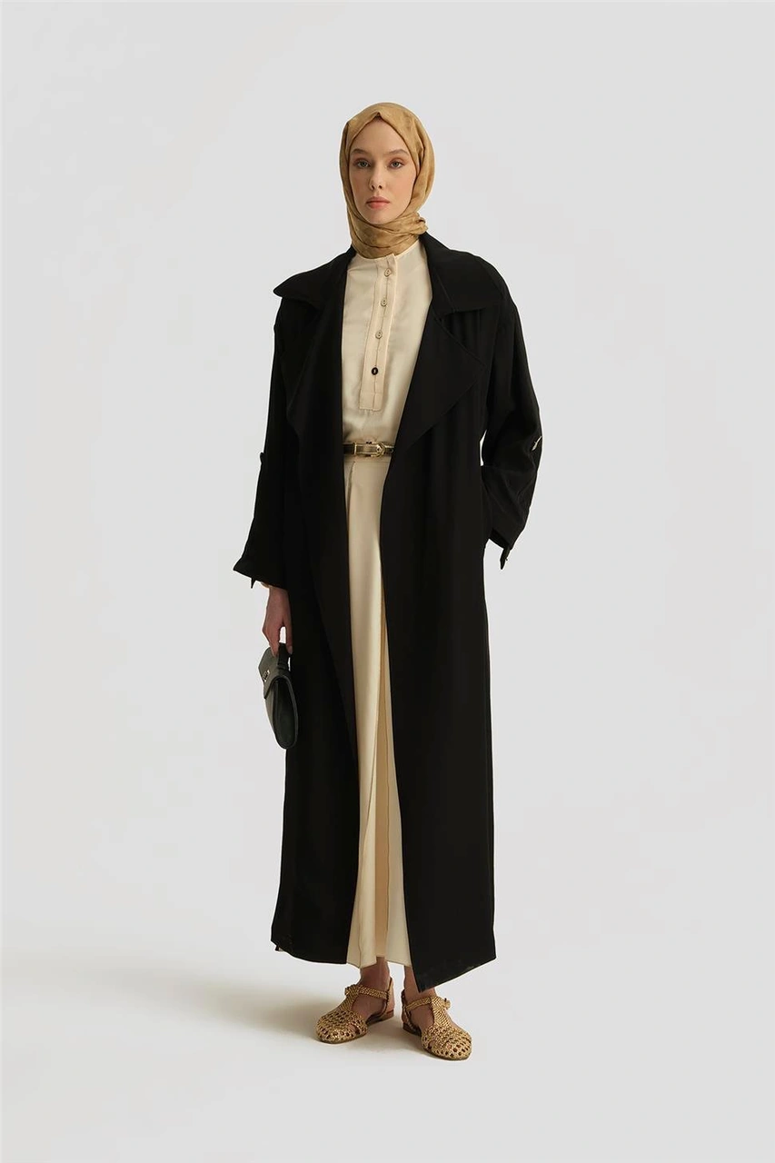 Medine İpeği Mevlana Kesim Cepli Kuşaklı Bol Büyük Beden Ferace Siyah