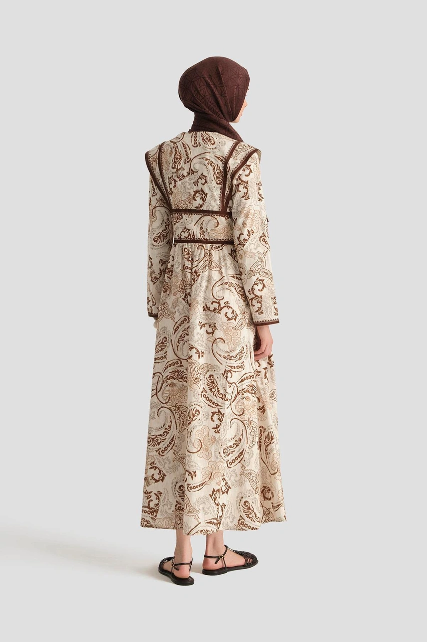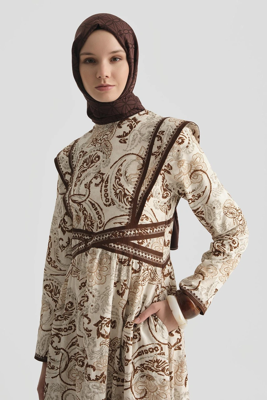 Armine Etnik Desenli Keten Elbise 25y9008 Kahverengi Kahverengi