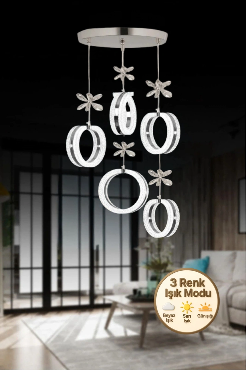 Aurea Model 5 Li Kristal Taşlı Gümüş 3 Renk Modu Ledli Salon Mutfak Oturma Odası Sarkıt Led Avize Gümüş