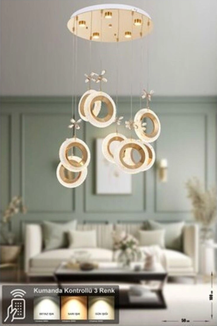 Avizemoda Ribera 8'li Power Ledli Kumandalı Modern Lüks Sarkıt Avize, 3 Renk: Sarı-beyaz-gün Işığı - Gold Mavi