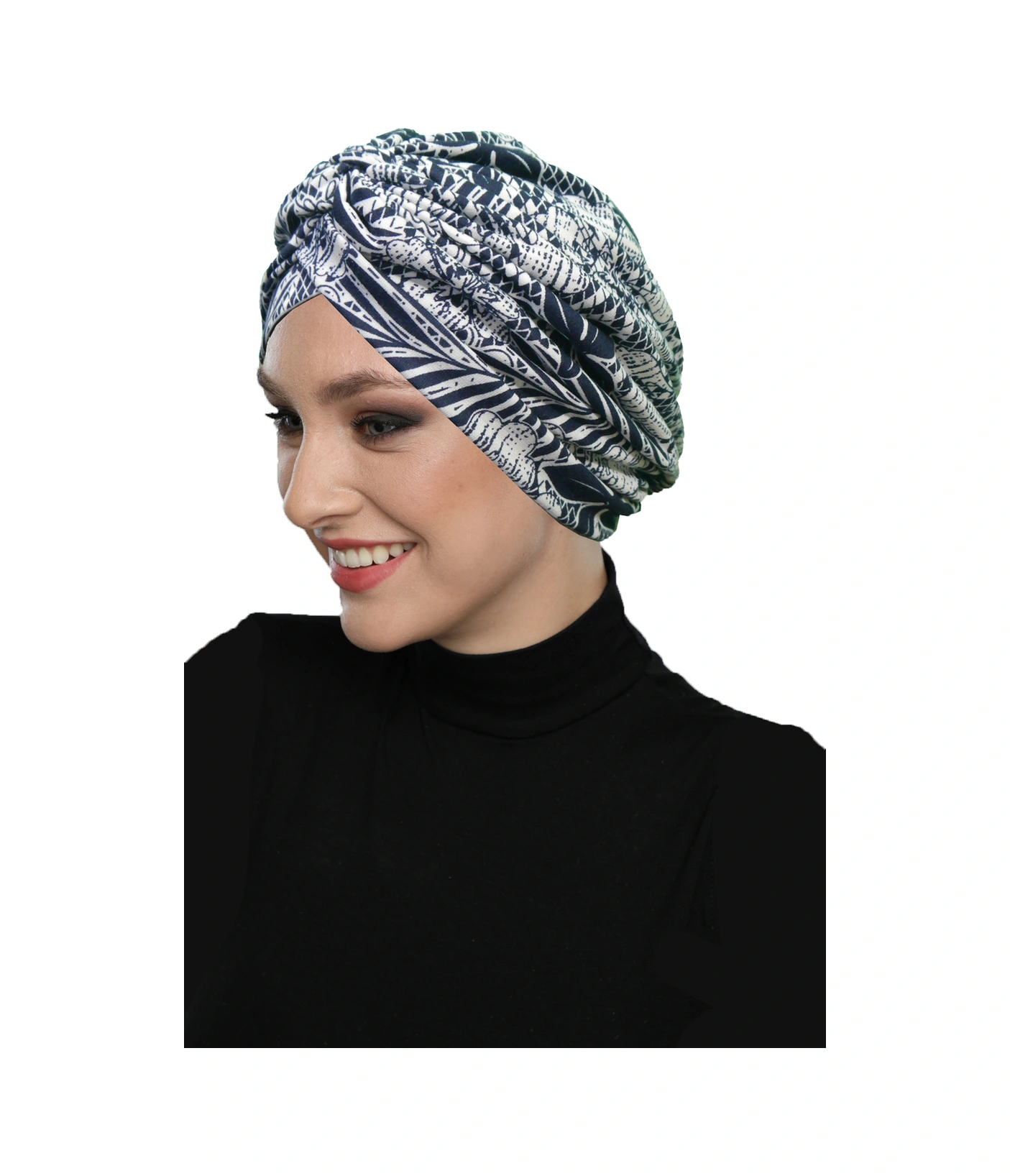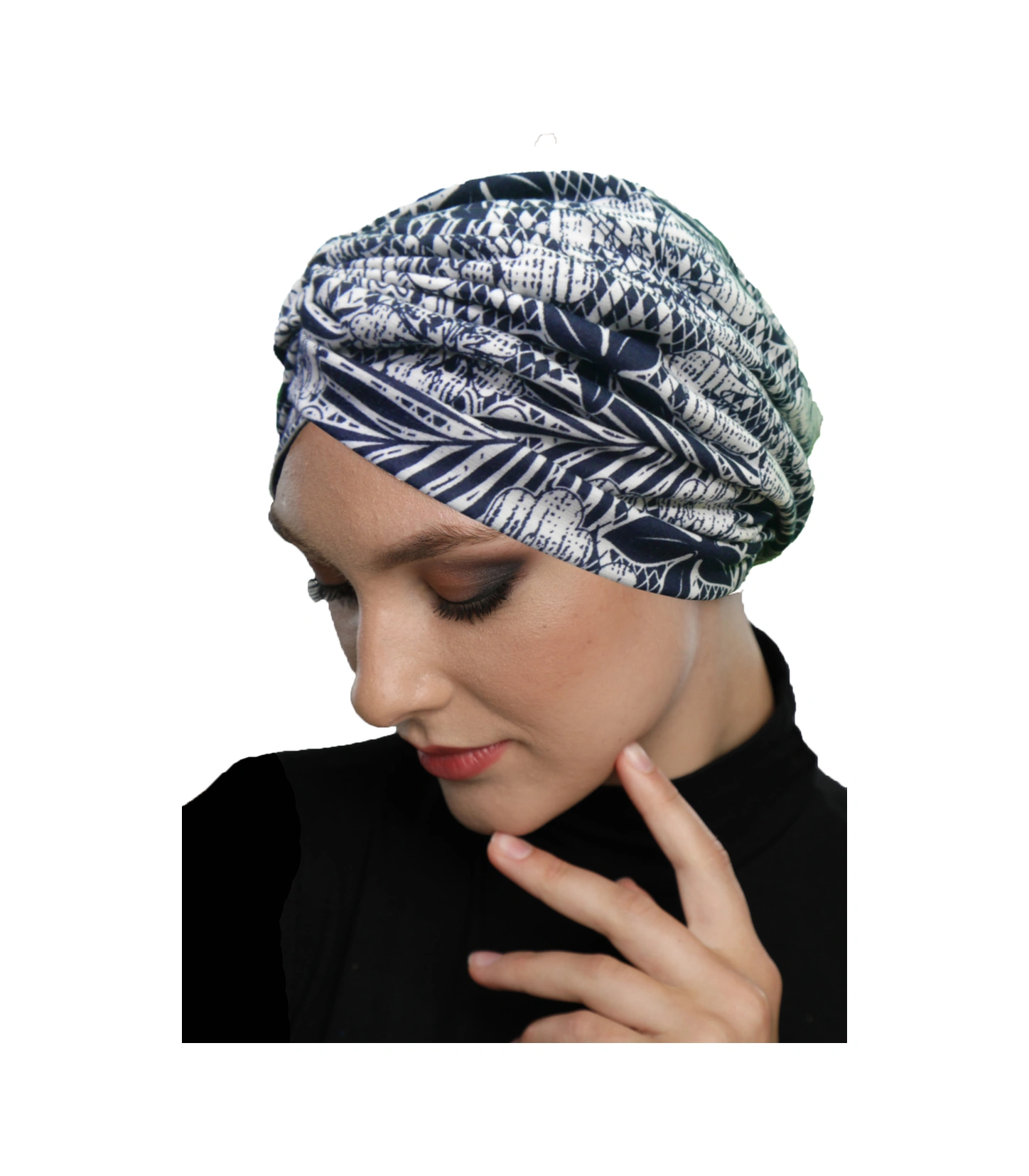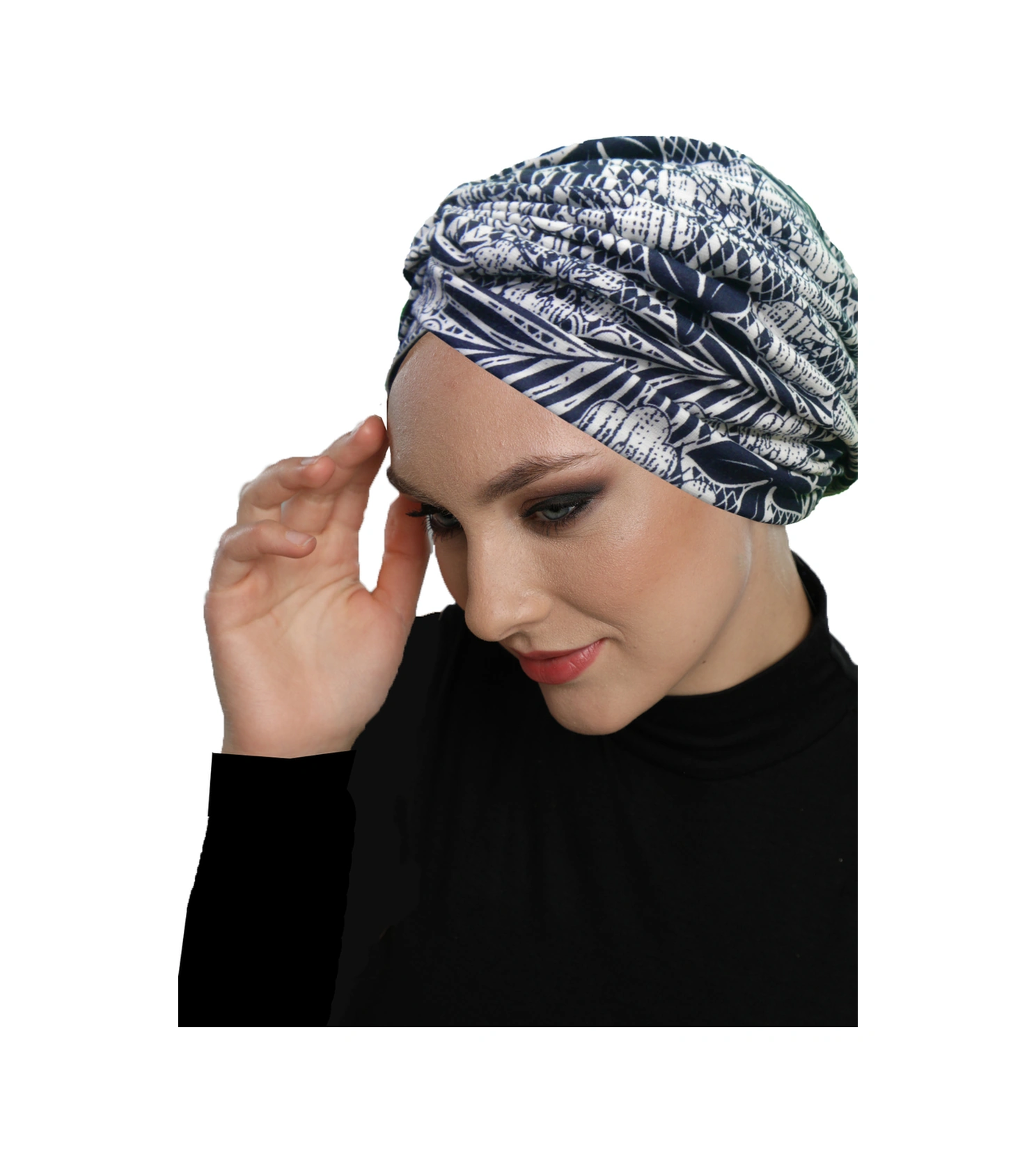 Ayışığı Çiçekleri Desenli Çapraz Ve Bant Detaylı Astarlı Hazır Türban Tesettür Havuz Bonesi Lacivert-beyaz