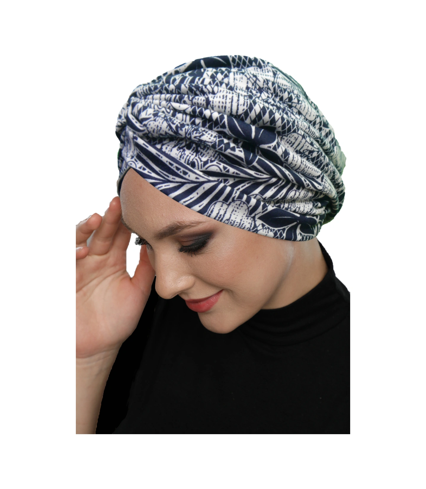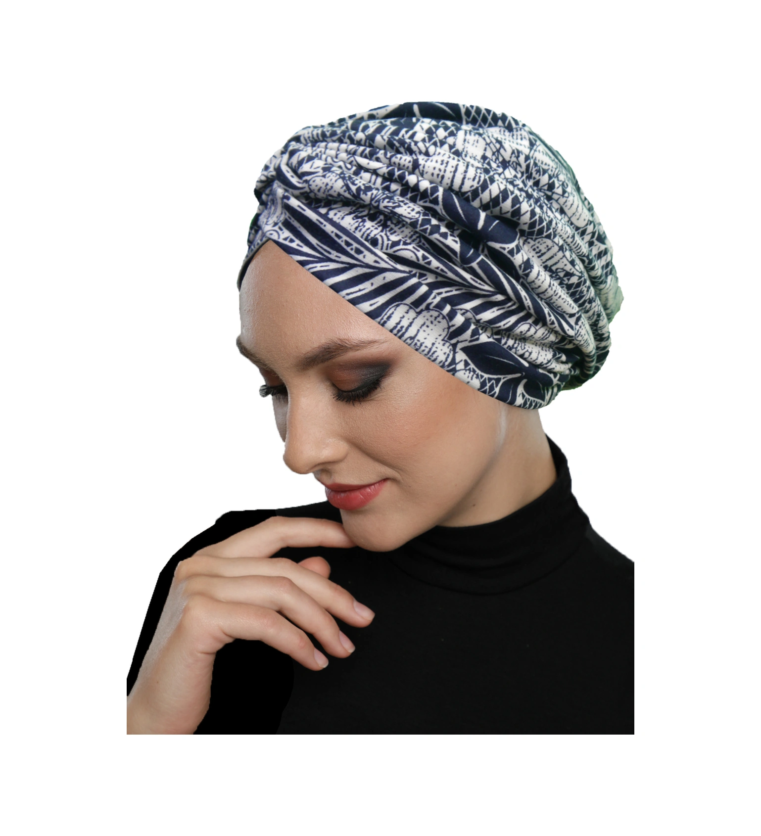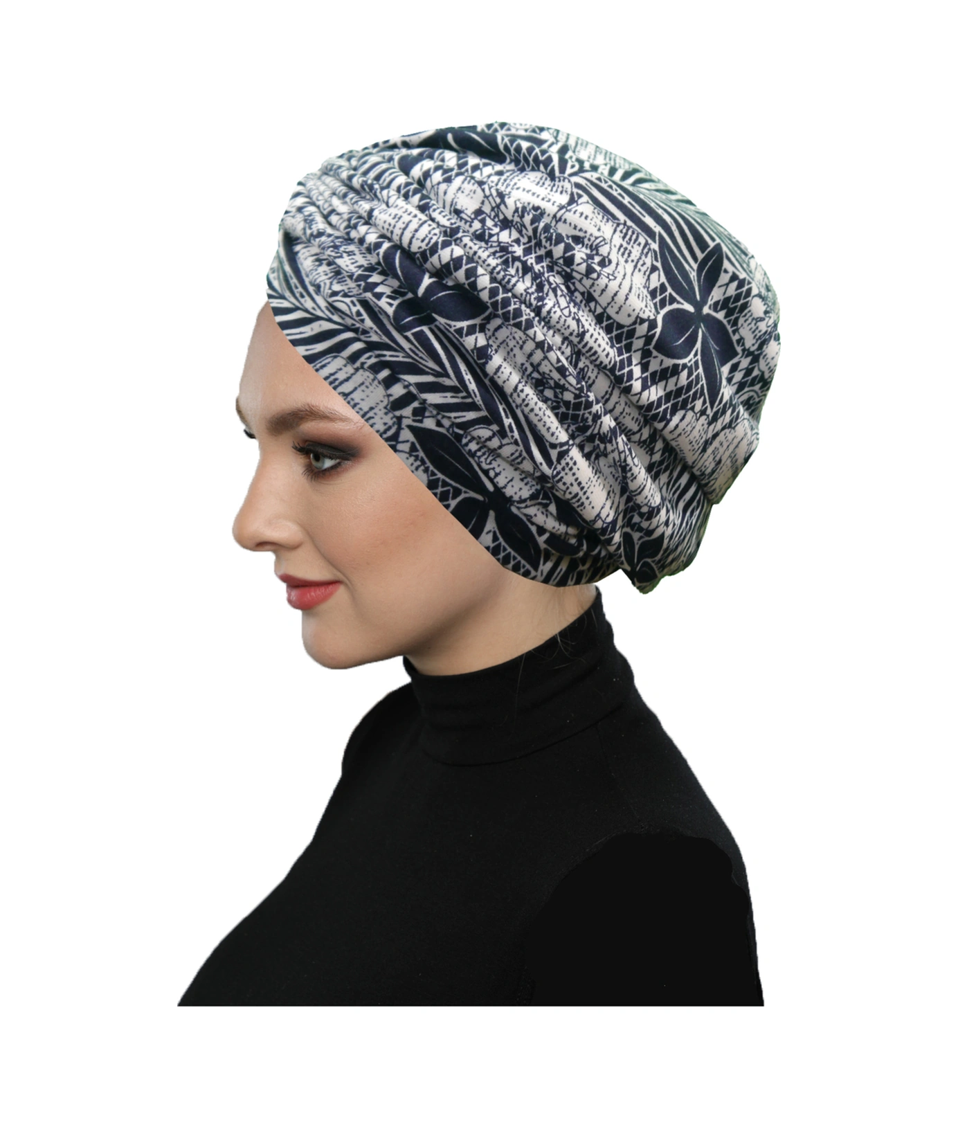 Ayışığı Çiçekleri Desenli Çapraz Ve Bant Detaylı Astarlı Hazır Türban Tesettür Havuz Bonesi Lacivert-beyaz