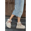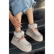 Bağcıklı Kalın Tabanlı Katlanır Yaka Kürklü Kadın Bot Bej