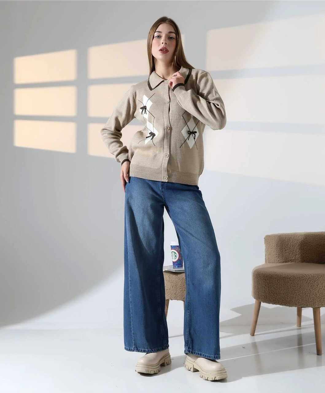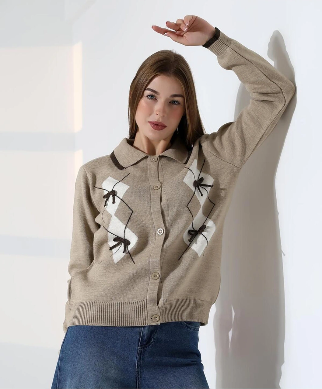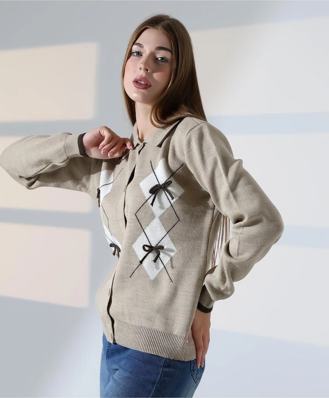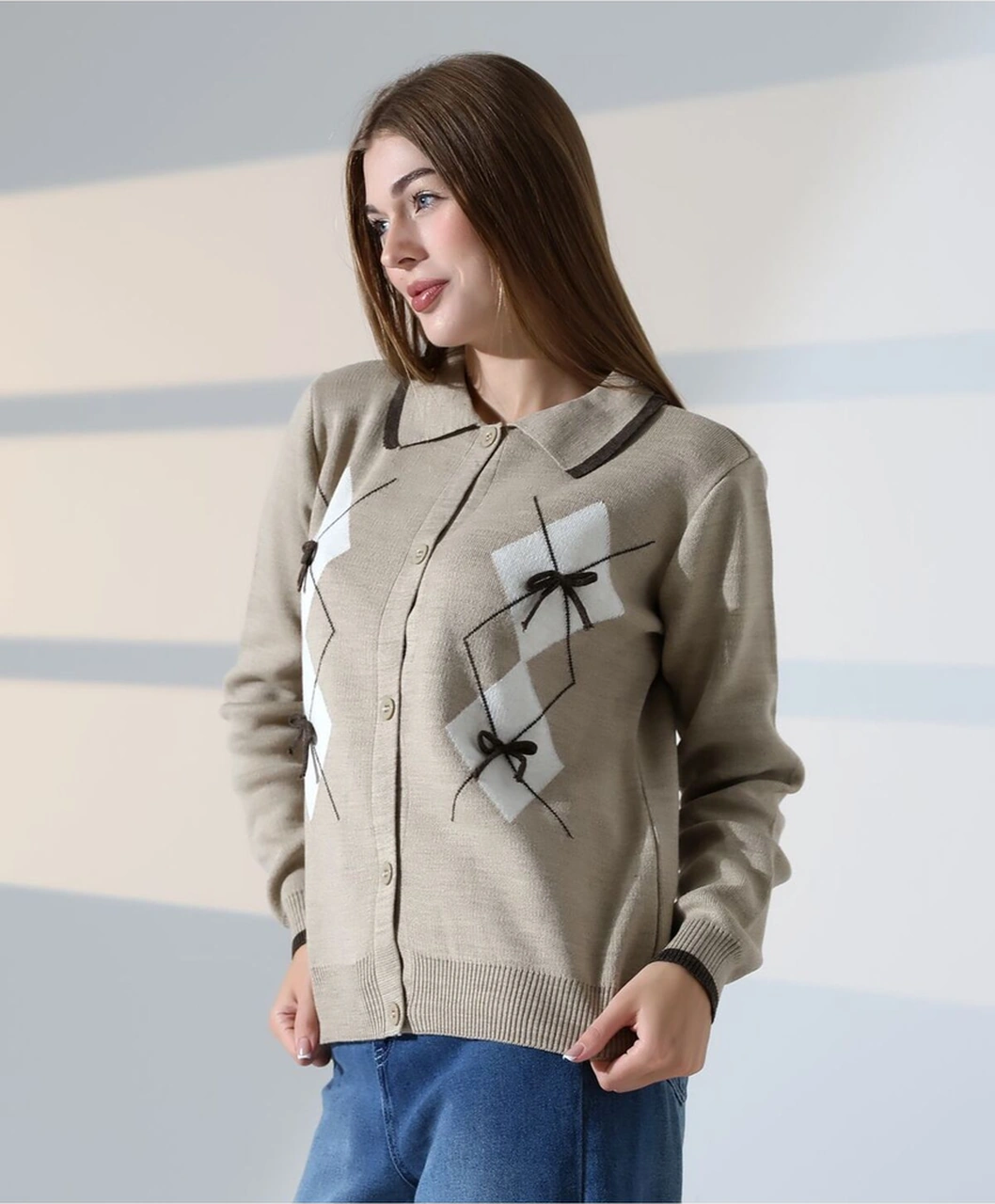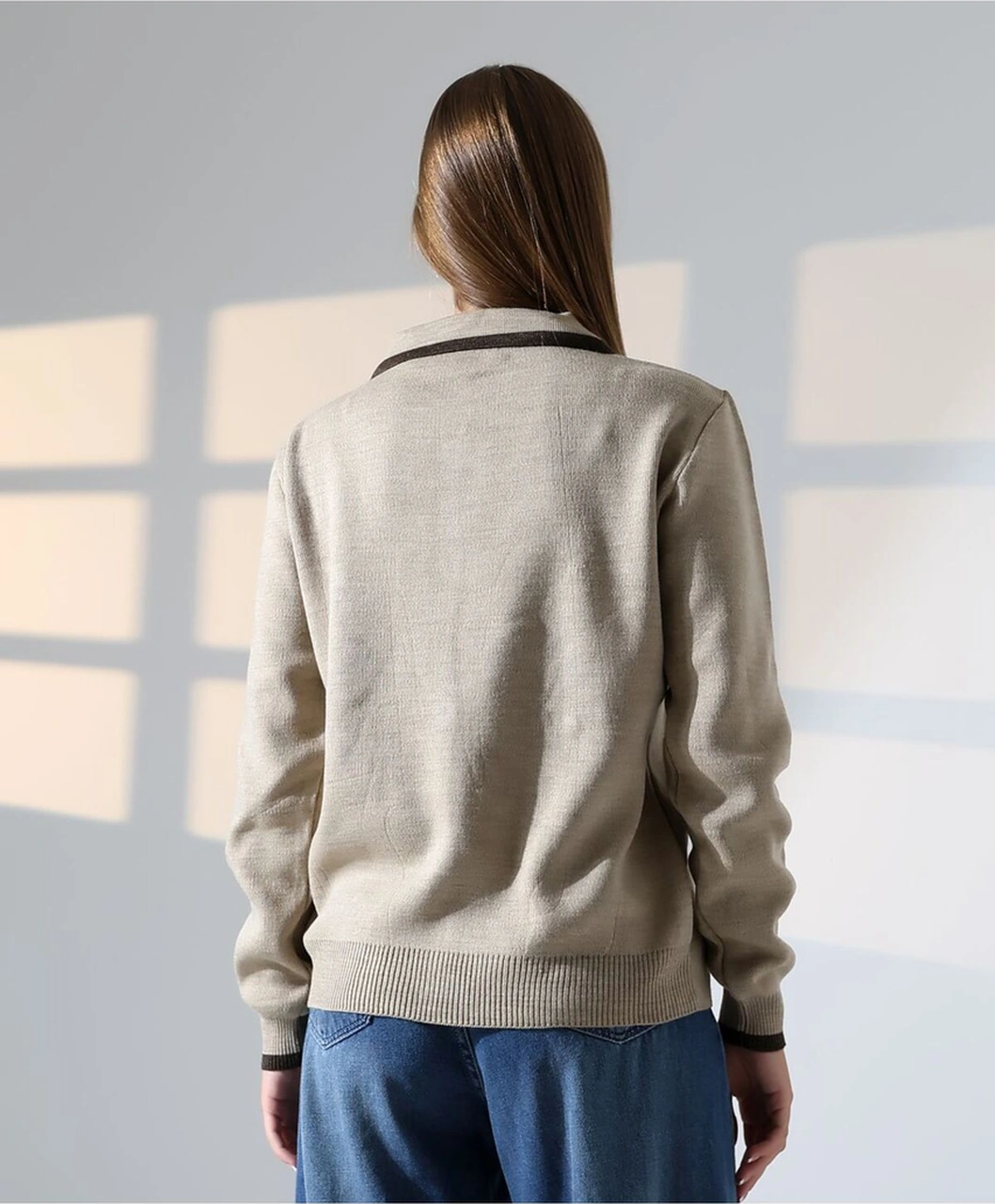 Baklava Desen Polo Yaka Kadın Kazak Vizon
