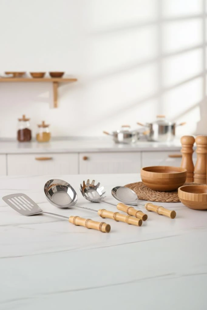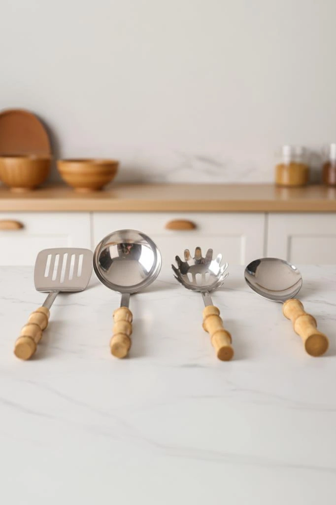 Bambum Mundo 4 Parça Bambu Saplı Çelik Mutfak Gereç Seti Çeyiz Seti Kaşık Kevgir Kepçe