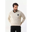 Baskılı V Yaka Uzun Kol Dokuma Triko - Bej Bordo