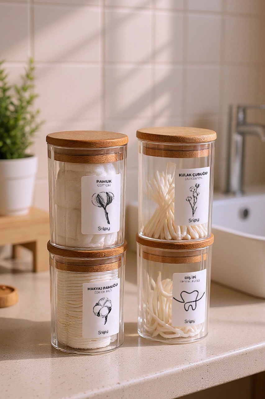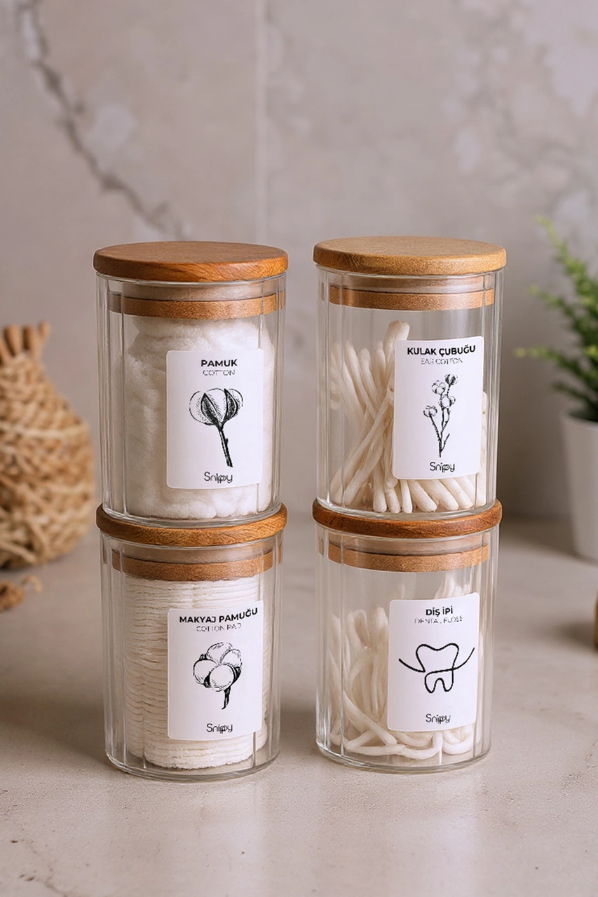 Bathy - 4'lü Ahşap Vakum Kapaklı Banyo Düzenleyici Plastik Banyo Seti Pamuk Düzenleyici Ahşap