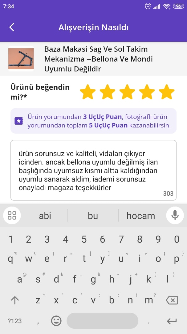 ürün sorunsuz ve kaliteli, vidaları çıkıyor icinden. ancak bellona uyumlu değilmiş ilan başlığında uyumsuz kısmı altta kaldığından uyumlu sanarak aldim, iademi sorunsuz onayladı magaza teşekkürler