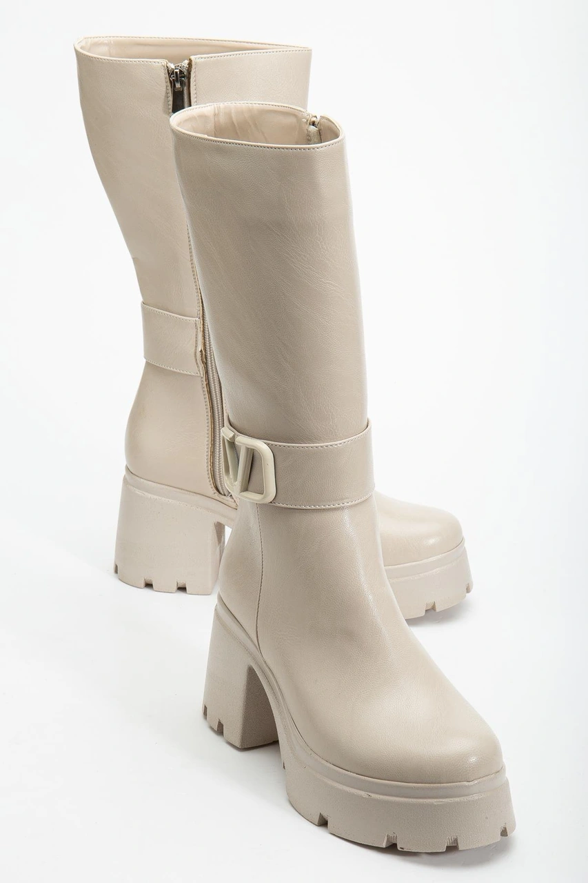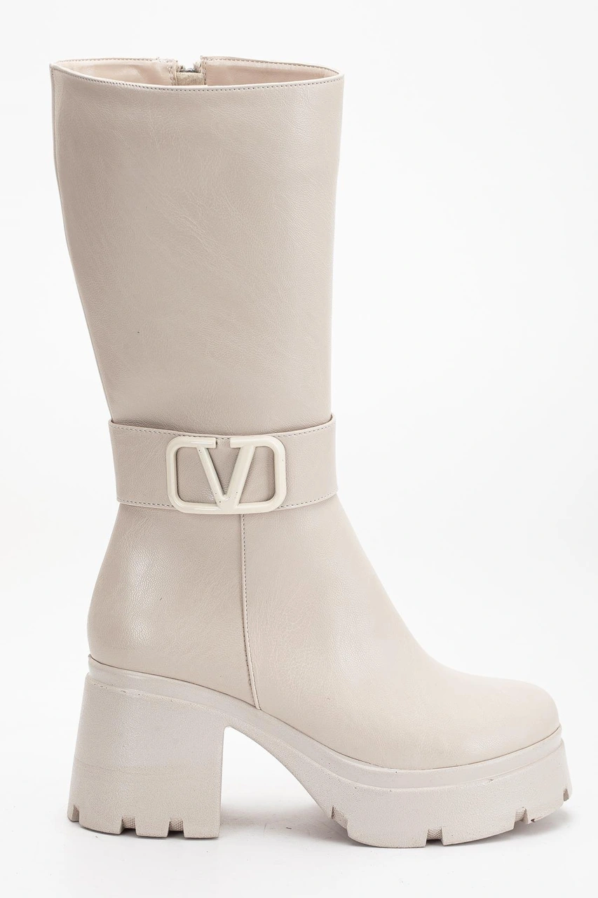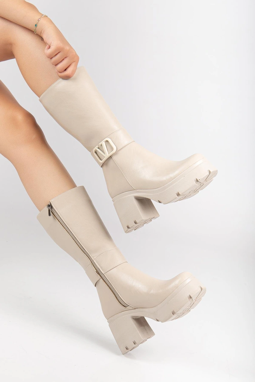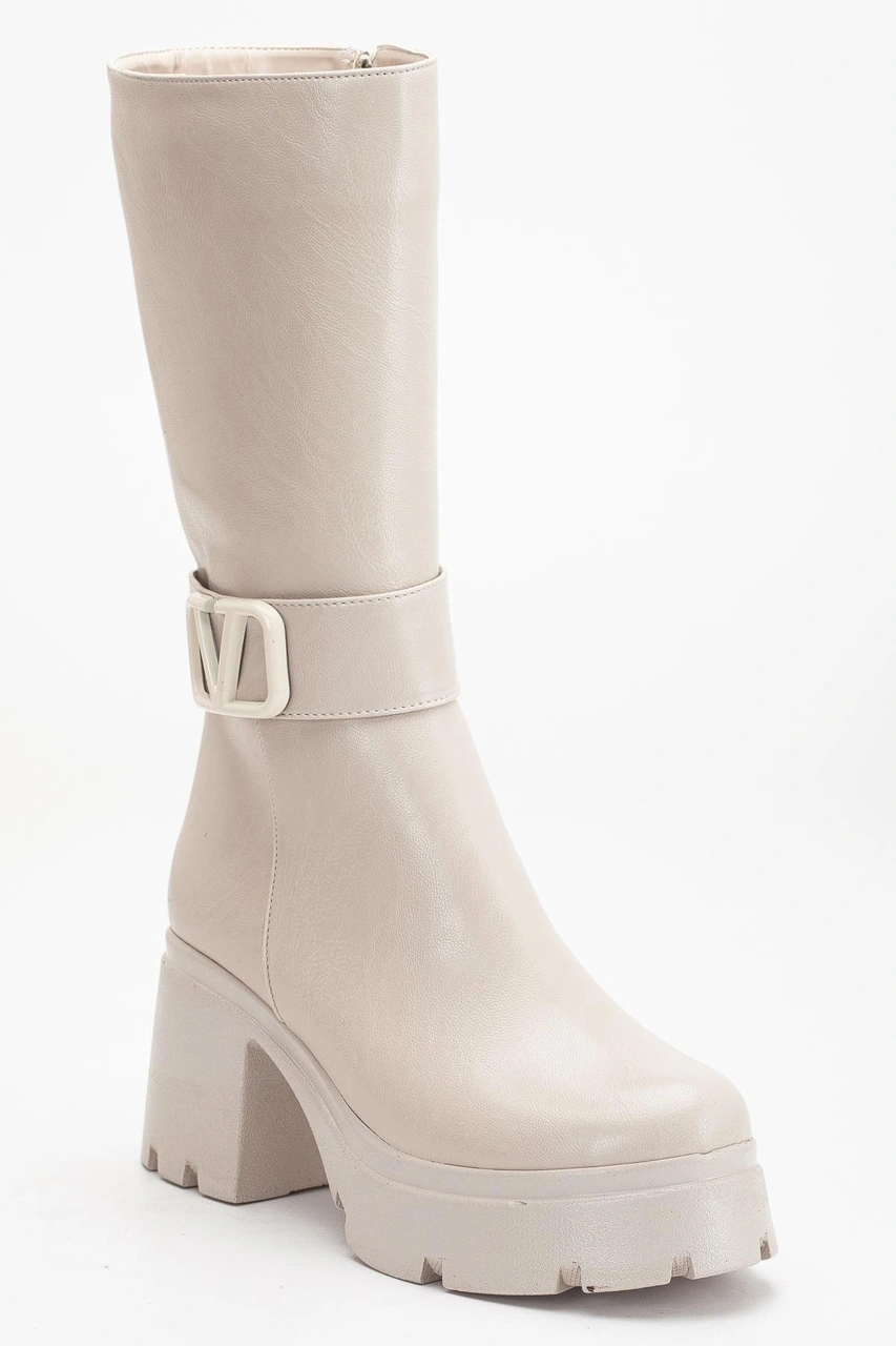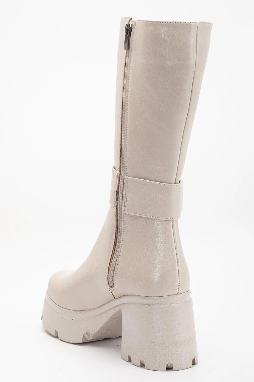 Bej Kadın Platform Topuklu Çizme Diz Altı Suni Deri Kemer Tokalı-4270 Bej