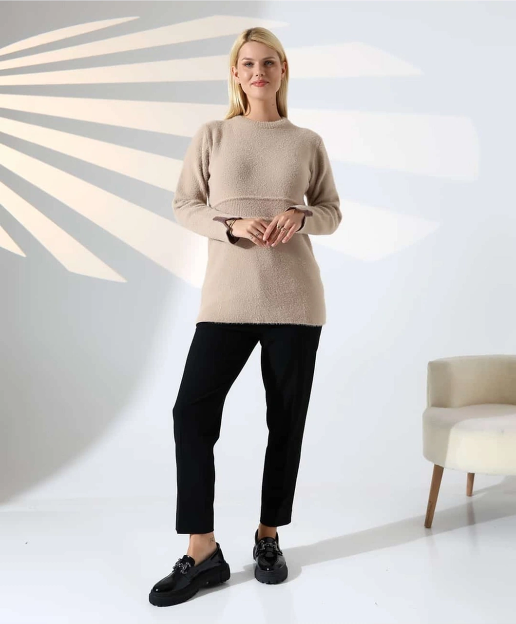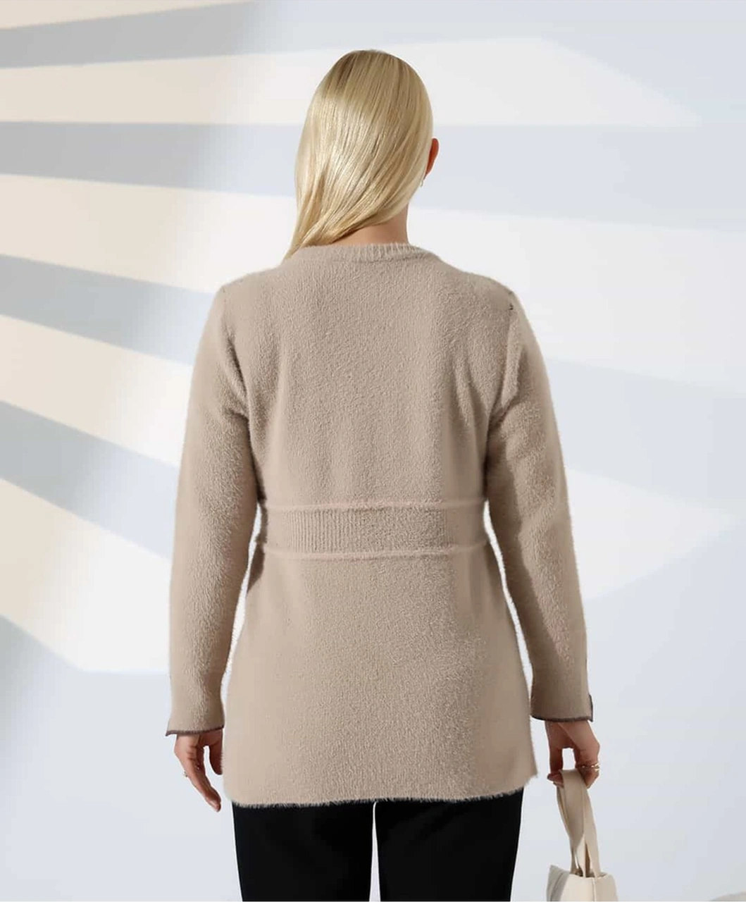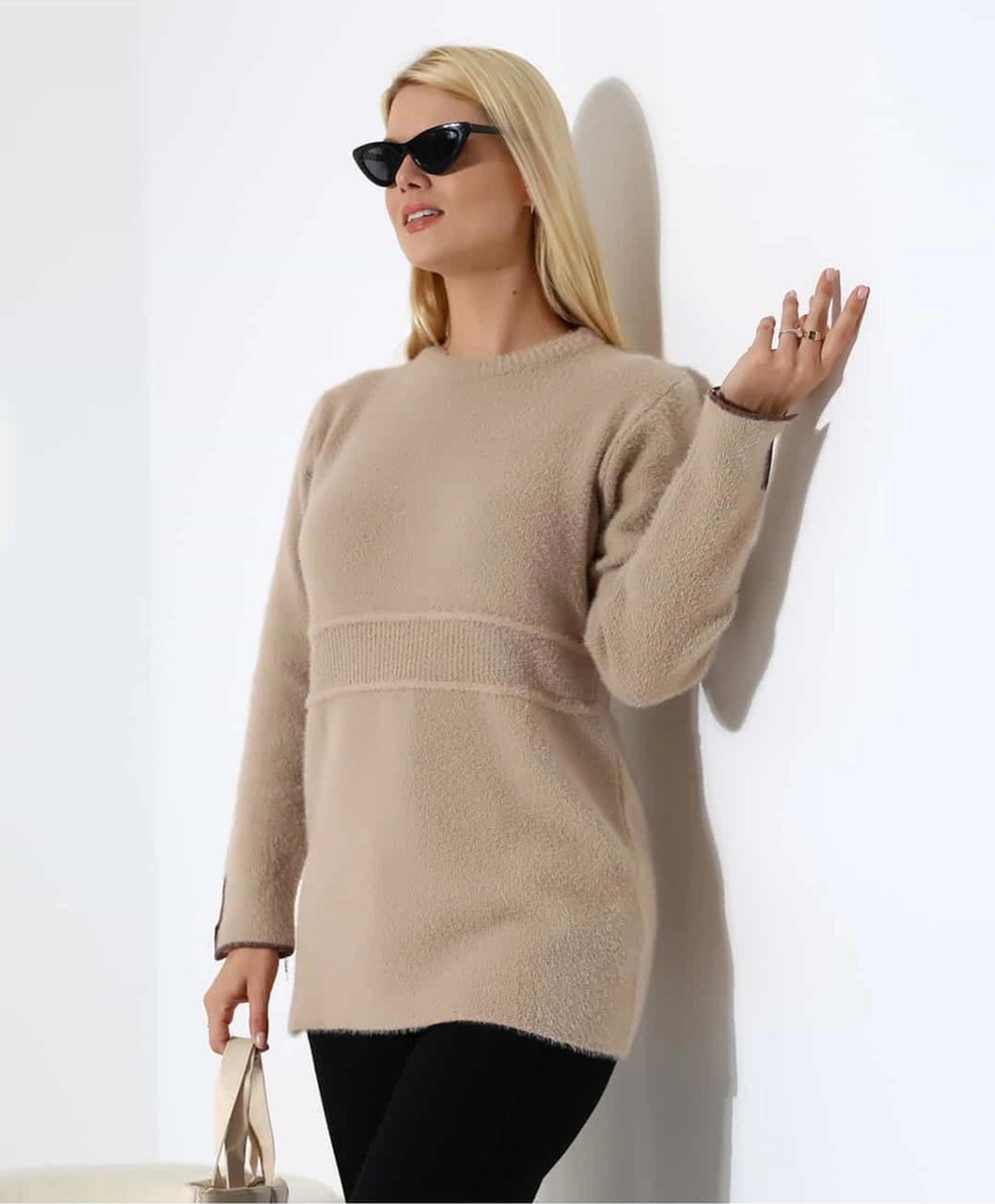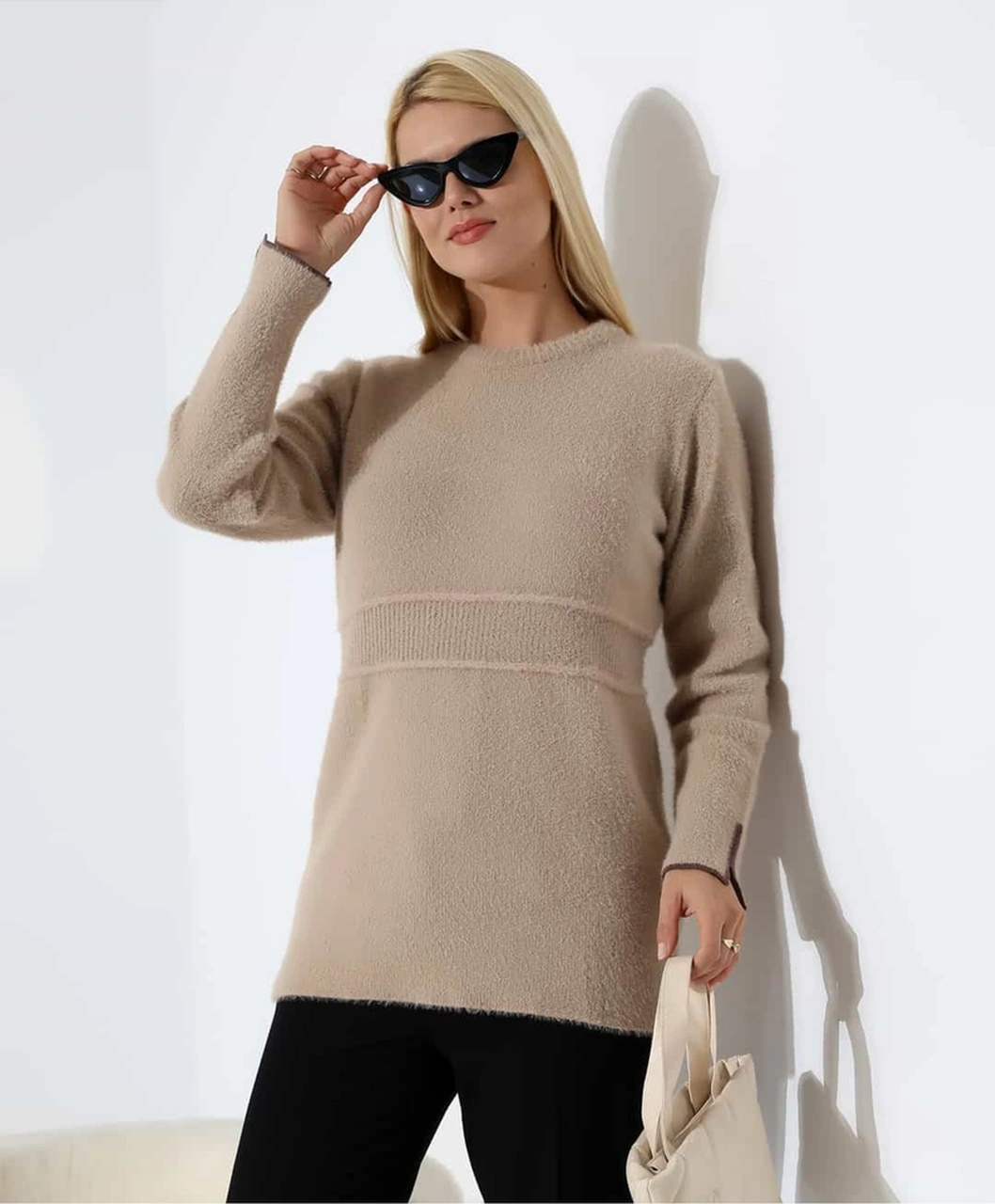 Bel Detaylı Yumuşak Triko Kazak Vizon